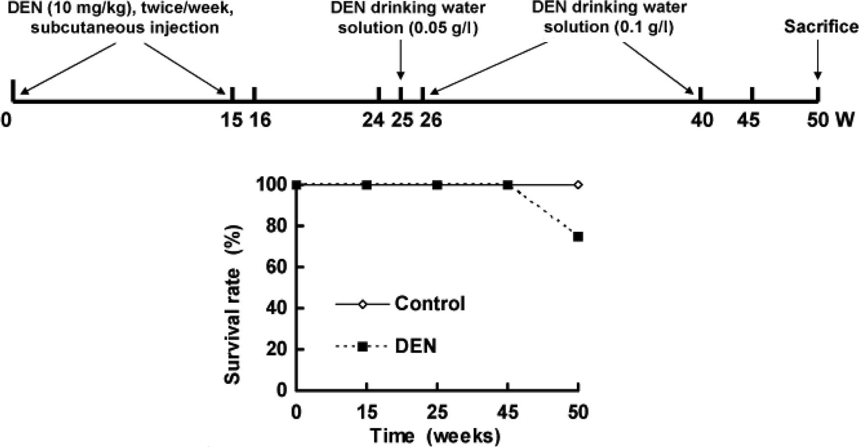 Fig. 1B shows the survival rate of hamsters. A total of 6 animals treated with DEN died between 45 and 50 weeks, whereas unexpected death was not observed in the control hamsters.
