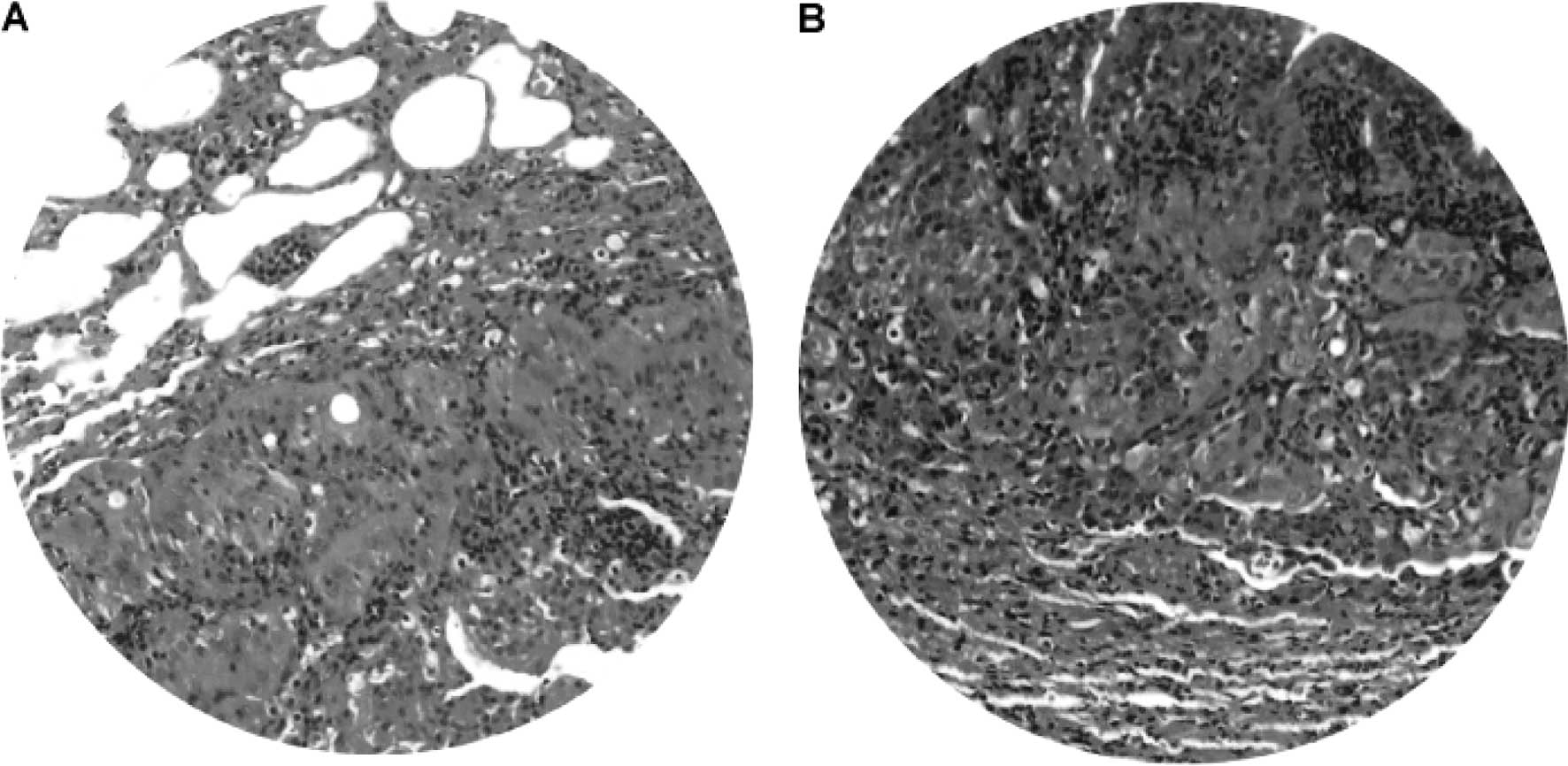 No tumors were observed in the control animals. The gross pathological findings of DEN-treated livers included ascites, hepatomegaly, small hepatic cysts and multiple hepatic nodules. Gross examination at 45 and 50 weeks of the DEN treatment demonstrated macronodular HCC in 33.3% (4/12) of the DEN-treated Syrian hamsters (Fig. 2). The livers with HCC were enlarged with multiple small nodules of 0.2–0.5 cm in diameter (Fig. 2A–D), or with a single large nodule of 3 cm in diameter (Fig. 2E). Light microscopy and H&E staining showed nodular HCC (Fig. 3A). There were frequent bizarre neoplastic cells and abnormal mitotic figures (Fig. 3B). In addition, the HCC nodules were accompanied by chronic inflammatory infiltrates (Fig. 3A) and separated by cords of atrophic hepatocytes (Fig. 3A).