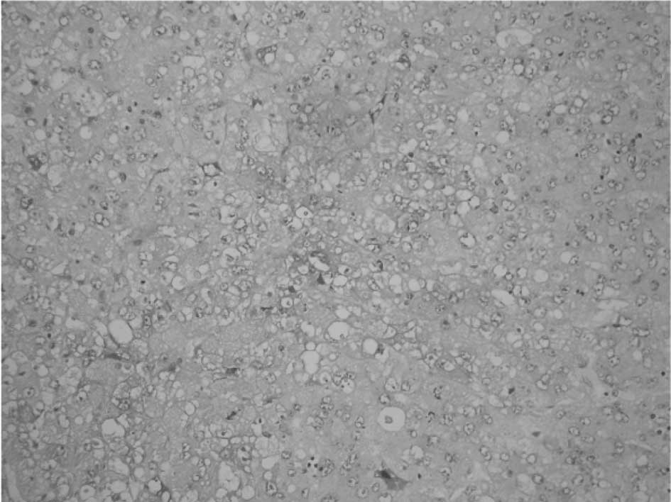 Primary human HCC exhibits characteristics, such as arterial phase hypervascularity with portal phase washout, and the presence of fatty degeneration and portal venous invasion. Intrahepatic biliary duct dilatation is well recognized with cholangiocarcinoma and is frequently observed in metastatic HCC (29). HCC is frequently accompanied by dilatation of the intrahepatic bile ducts (30–37), while focal bile duct hyperplasia often occurs in the adjacent non-tumorous liver tissue of European patients (38). In this study, pre-neoplastic lesions, including focal bile duct hyperplasia, fatty change and clear cell hyperplasia, occurred in DEN-induced hepatocarcinogenesis.