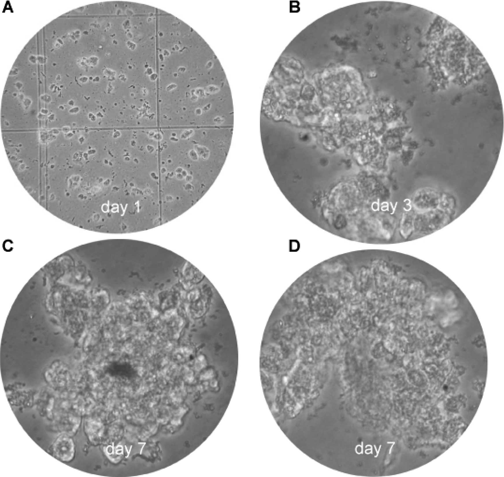 The use of primary cultures from tumor cells is a promising approach for the development of new methods for the diagnostics and therapy of cancer. Fig. 6 illustrates the cultured HCC cells on day 1 (Fig. 6A), day 3 (Fig. 6B) and day 7 (Fig. 6C and D). Clone expansion and confluence was time-dependent in this primary cell culture.