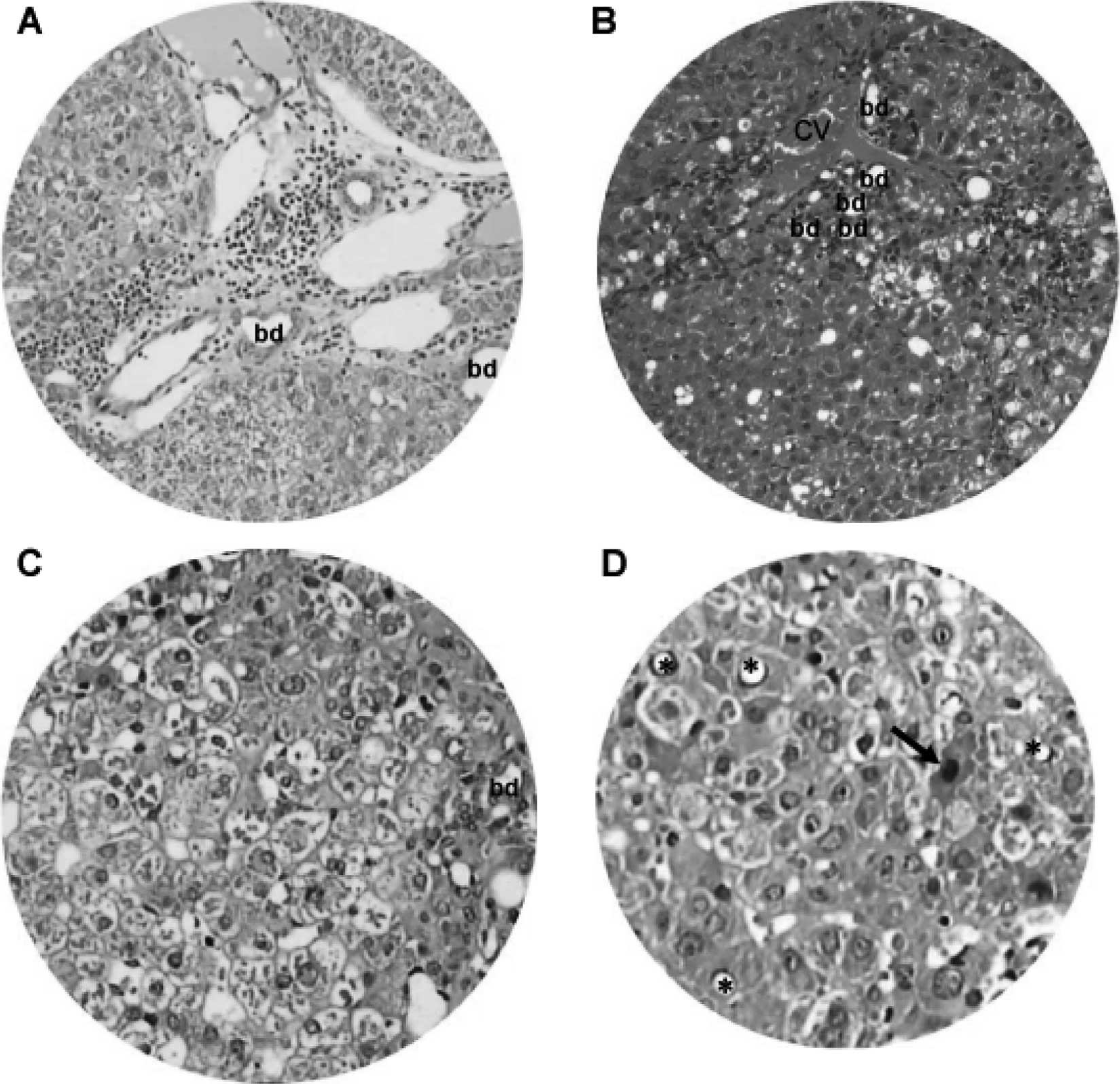 From 15 weeks onward, DEN-treated animals showed chronic inflammatory infiltrates, dilated lymph vessels and proliferating bile ducts in the portal area (Fig. 7A). In addition, fatty change and clustering of proliferative bile ducts were found adjacent to the central vein (Fig. 7B). Hepatocytes in the DEN-treated hamsters also underwent degenerative changes, such as nuclear vacuolation, ballooning degeneration (Fig. 7C) and eosinophilic necrosis (Fig. 7D).