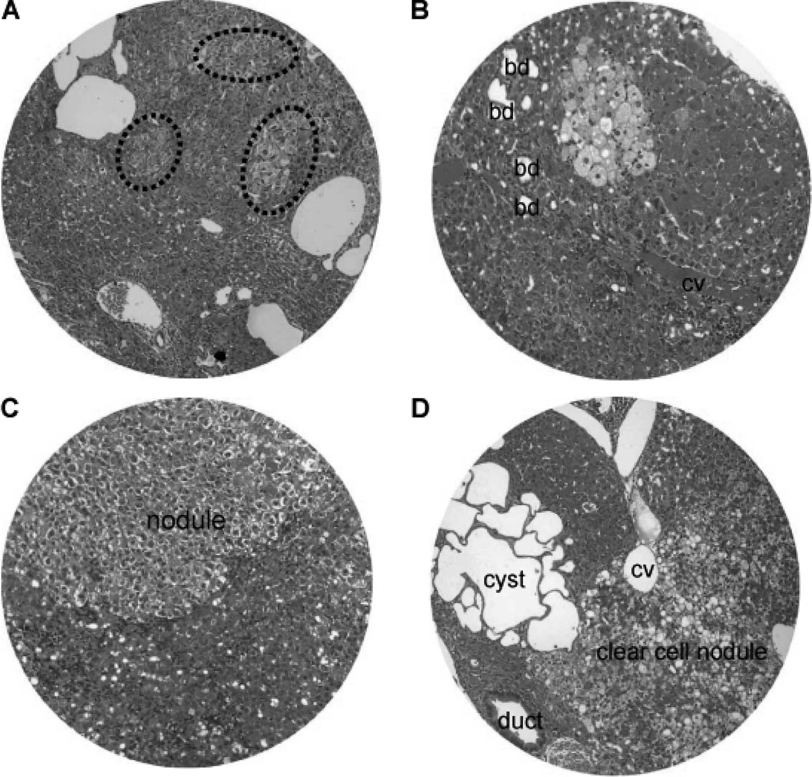 Nodular hyperplasia and hyperplastic nodules were encountered in the hamsters at 16–24 weeks of the DEN treatment (Fig. 8). The size of the nodular lesions varied from a pinpoint to 1.5 cm in diameter. The nodular lesions included patches of clear cell hyperplasia coexisting with dilated blood vessels (Fig. 8A), focal clear cell hyperplasia accompanying proliferating bile ducts and chronic inflammatory cells adjacent to the central vein (Fig. 8B), and well-defined nodular hyperplasia arising from the background of chronic inflammation and hepatocyte degeneration (Fig. 8C). In addition, clear cell nodules and focal clustering of microcysts often existed (Fig. 8D).