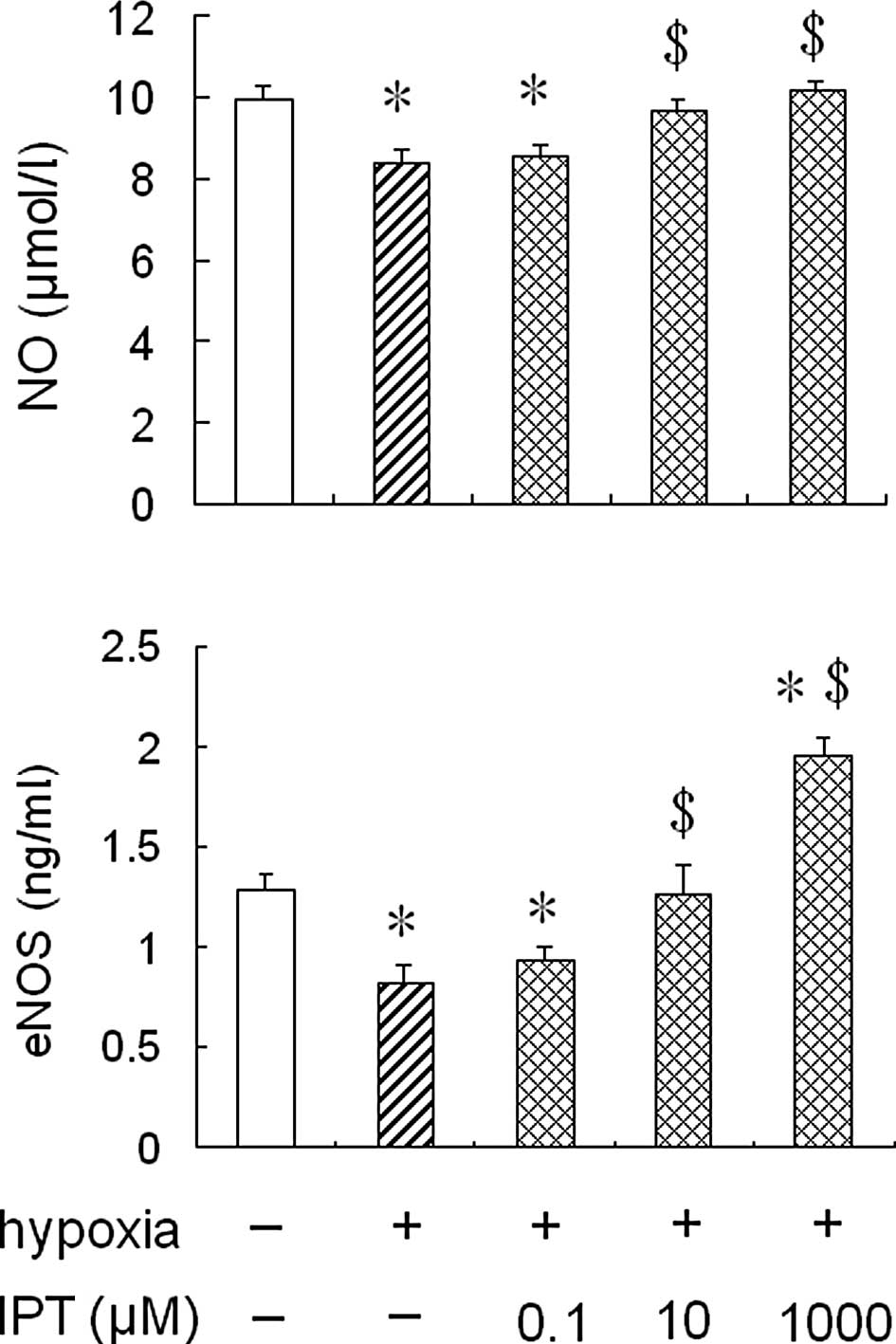 In the present study, to assess whether hypoxia inhibits endothelial nitric oxide synthase (eNOS) activity and NO production, and whether iptakalim can rescue HPAECs from hypoxia-induced NO system dysfunction, HPAECs were cultured under hypoxic conditions in the absence or presence of 0.1, 10 and 1,000 μM iptakalim or the combination of 10 μM iptakalim and 1, 10 and 100 μM glibenclamide for 24 h; the eNOS activity and NO levels were measured in the conditioned medium from the HPAEC cultures.