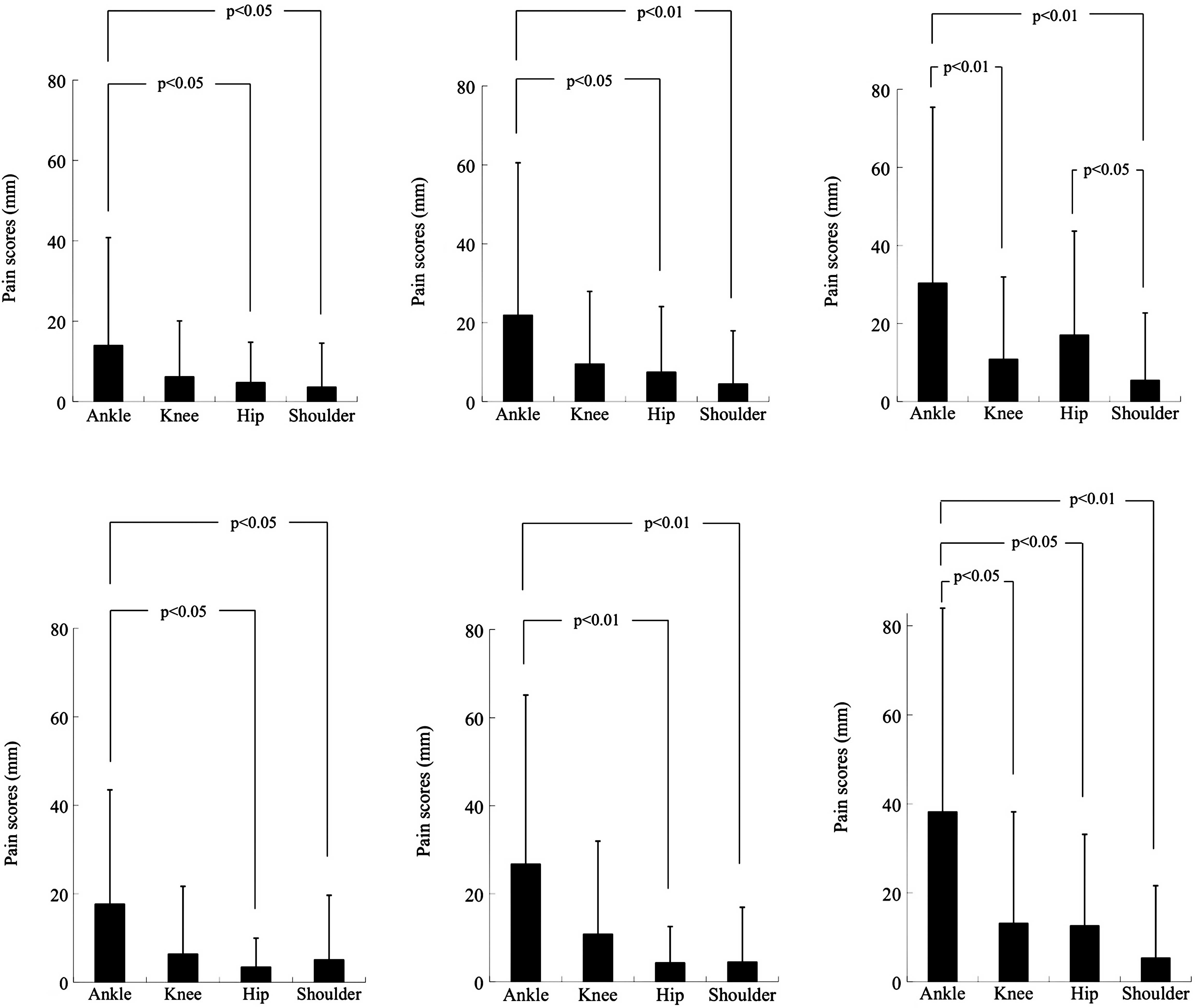 In the course of health management of collegiate soccer players, we noticed that most players, particularly leading players, suffer from subtle lower extremity joint pains that are self-recognized only when they engage in the training and/or soccer games, although they are not diagnosed as having joint injuries. Thus, we speculated that these conditions may result from clinically unrecognized minute joint injuries and that such injuries may also increase the risk of subsequent development of OA or other degenerative joint diseases (1). The aim of the present study was to examine at which joints the minute injury-mediated subclinical joint pains occur and are observed in soccer players. For this purpose, pains were measured at several different joints, mainly lower extremity joints, using 3 pain subscales of a 100-mm visual analog scale (VAS) in a team of collegiate soccer players.