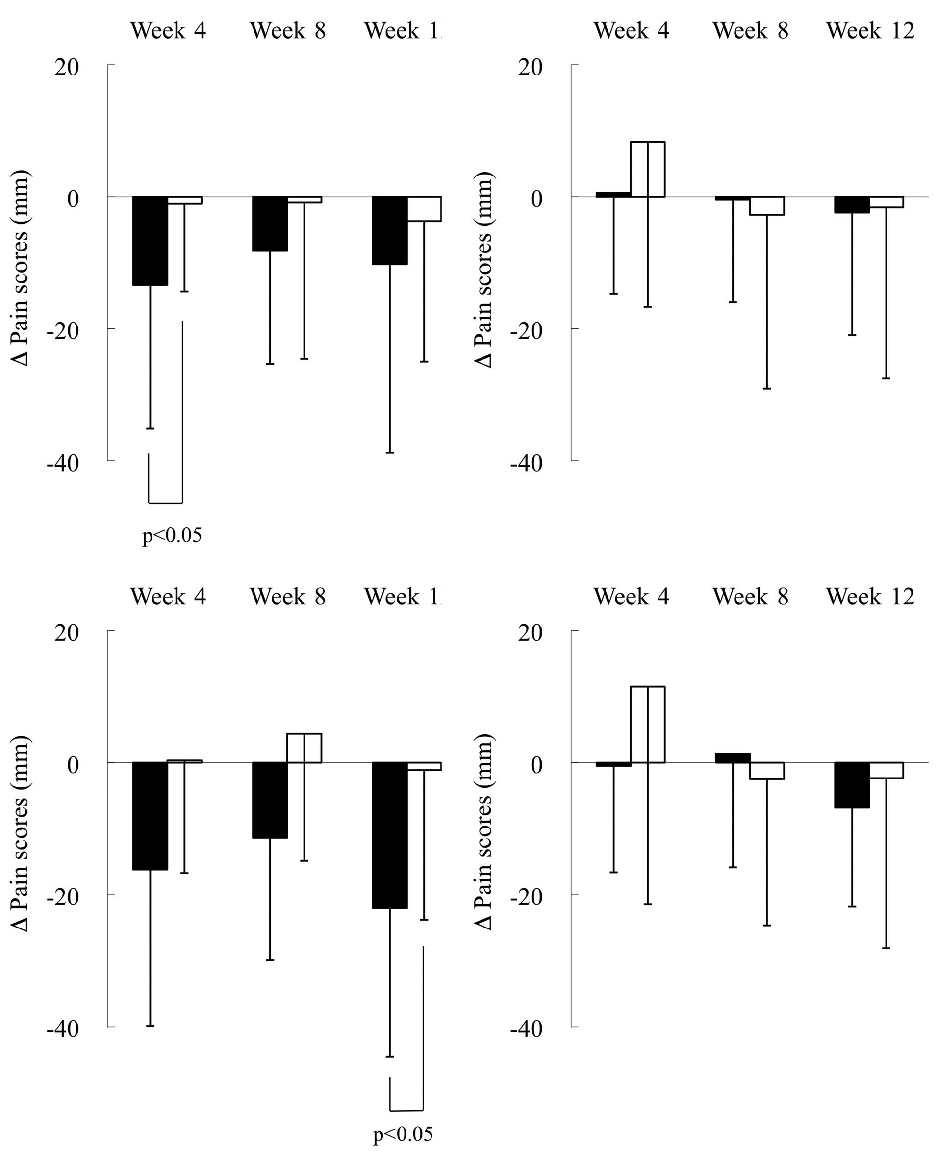 Values of all variables were expressed as the means ± standard deviation (SD). Individual VAS scores for 3 pain subscales at 4 different joints measured prior to the start of intervention were compared by the Student's t-test. Baseline characteristics of the total subject population and the leading players were compared between the test and placebo groups by the Student's t-test for continuous variables and by the Mann-Whitney U test for category variables. Pain scores during the intervention were compared to the baseline values by the Student's t-test. Comparisons of the changes from the baseline in pain scores were also performed by the Student's t-test. A p-value <0.05 was considered to indicate a statistically significant difference.
