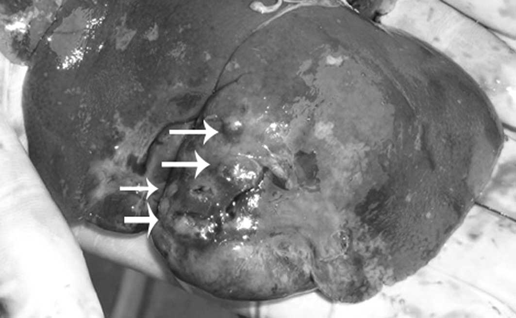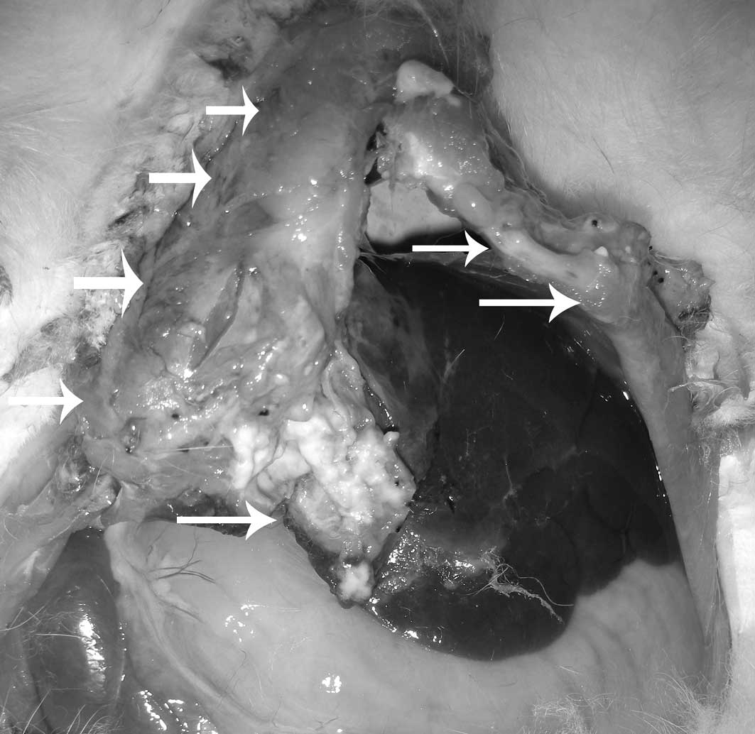 In group 1, 8 rabbits displayed no evidence of liver tumor growth at 2 weeks following implantation. Liver tumors were grown in 14 out of 22 rabbits with an overall success rate of 63.6%. In group 2, only 1 rabbit displayed no evidence of liver tumor growth. Successful liver tumor growth was achieved in 21 out of the 22 rabbits with an overall success rate of 95.5%. Upon further sub-analysis, single nodular tumors in the liver were observed in 4 out of 14 rabbits in group 1 (28.6%) and 14 out of 21 rabbits in group 2 (66.7%) (Figs. 2–5). Multinodular tumors in the liver were grown in 10 out of 14 rabbits in group 1 (71.4%) and in 7 out of 21 rabbits in group 2 (33.3%) (Fig. 6). In addition, extrahepatic metastases were observed in 5 out of 14 rabbits in group 1 (35.7%) and in 1 of 21 rabbits in group 2 (4.9%) (Fig. 7). There were statistically significant differences between the 2 groups. The overall liver tumor growth rate of group 1 was significantly lower than that of group 2 (P=0.025). Furthermore, the single nodular tumor growth rate of group 1 was significantly lower than that of group 2, and the multinodular tumor growth rate of group 1 was significantly higher than that of group 2 (P=0.041). Finally, a higher incidence of extrahepatic metastasis was observed in group 1 (P=0.028).