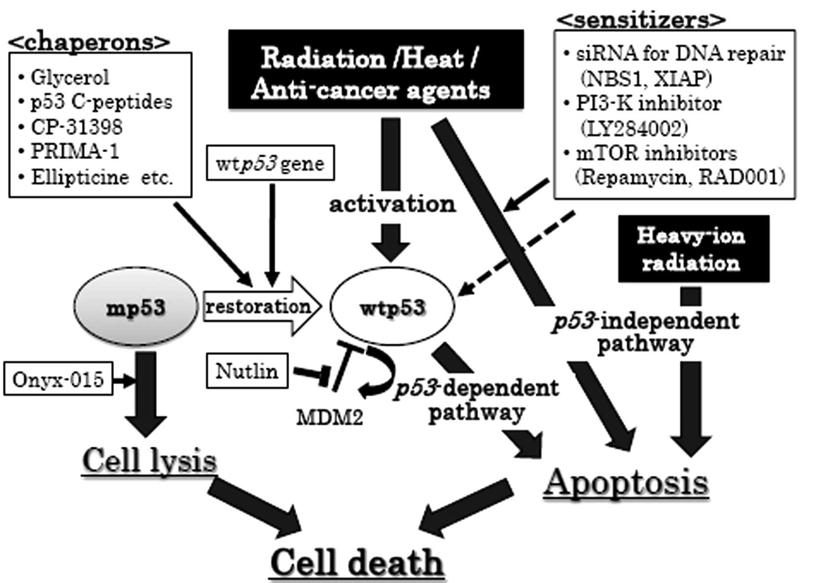 Over the past few decades, despite the introduction of new multimodal therapies, there has been a failure to achieve a high efficacy in tumor therapy. This may be caused by a primary or acquired resistance to the DNA damaging agents used in chemotherapy and radiotherapy, and remains a formidable and poorly understood problem. This review discussed the effect of p53-targeting cancer therapies on p53 signaling pathways, including p53-gene therapy, chemical chaperones, p53 C-terminal peptides, p53-targeting chemicals and inhibitors targeting several signaling pathways, in an effort to induce cell death in cancer cells. High-LET radiation can induce apoptosis effectively regardless of the genetic status of the p53-gene in cancer cells. Identification of the p53 status in the target cells is imperative, and the knowledge of additional oncogenic events contributing to specific types of cancer could significantly aid in the selection of appropriate therapeutic protocols. The restoration of p53 functioning could be helpful when pathways upstream of p53 expression are defective, but not if defects are downstream of p53 signaling. The re-expression and re-activation of p53 in human cancer cells could increase tumor susceptibility to radiation or chemotherapy, enhance the efficacy of standard therapeutic protocols, and lead to individually designed therapies (52). Further investigations in this area will hopefully lead to more effective cancer treatments in the near future.