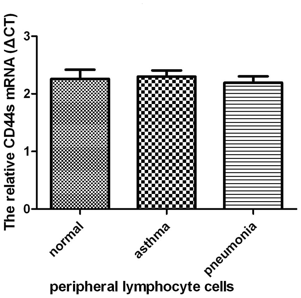 The CD44v also promote ECM-derived survival signals mediated through integrin activation through OPN-CD44V interaction (14). As such, CD44v should play a vital role in the pathogenesis of asthma and there may even be some CD44v uniquely expressed on the peripheral blood lymphocyte cells of asthmatic patients. The aim of this study was to determine whether there are specific CD44 isoforms expressed on peripheral blood lymphocytes of asthmatic patients compared with normal individuals and pneumonia patients.