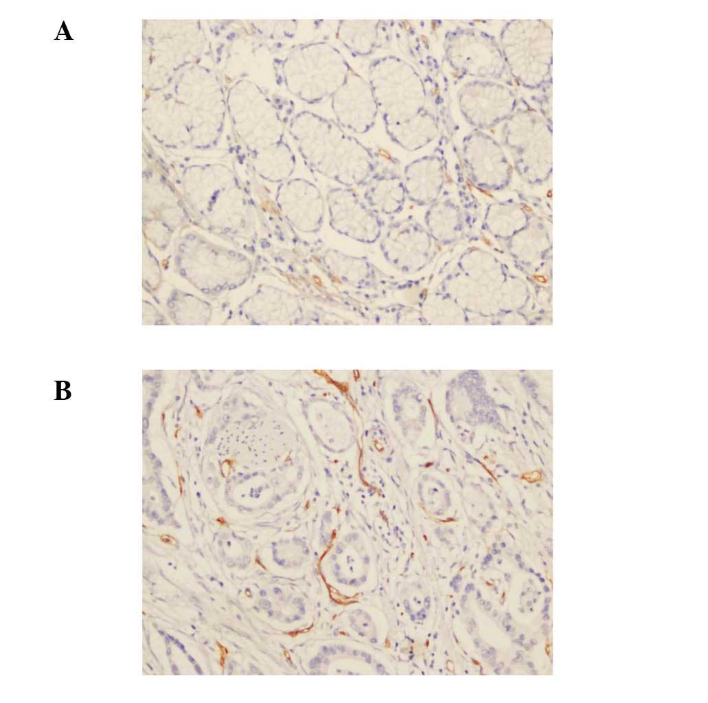 Immunohistochemical staining using monoclonal antibody to CD34 (Santa Cruz) was performed as described above to measure microvascular density (MVD) in the tumor tissue and corresponding non-neoplastic mucosa. Stained vessels were counted under high-power microscopic fields. The average number of vessels counted in the best-visualized area was recorded for each case (30).