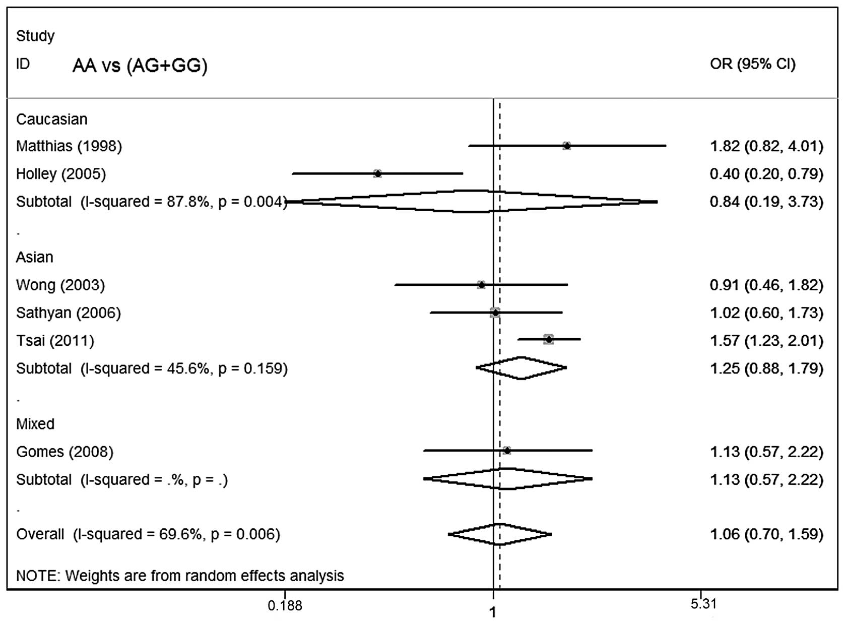 We analyzed the heterogeneity of an additive model (AA vs. GG), dominant model (AA+AG vs. GG) and recessive model (AA vs. AG+GG).