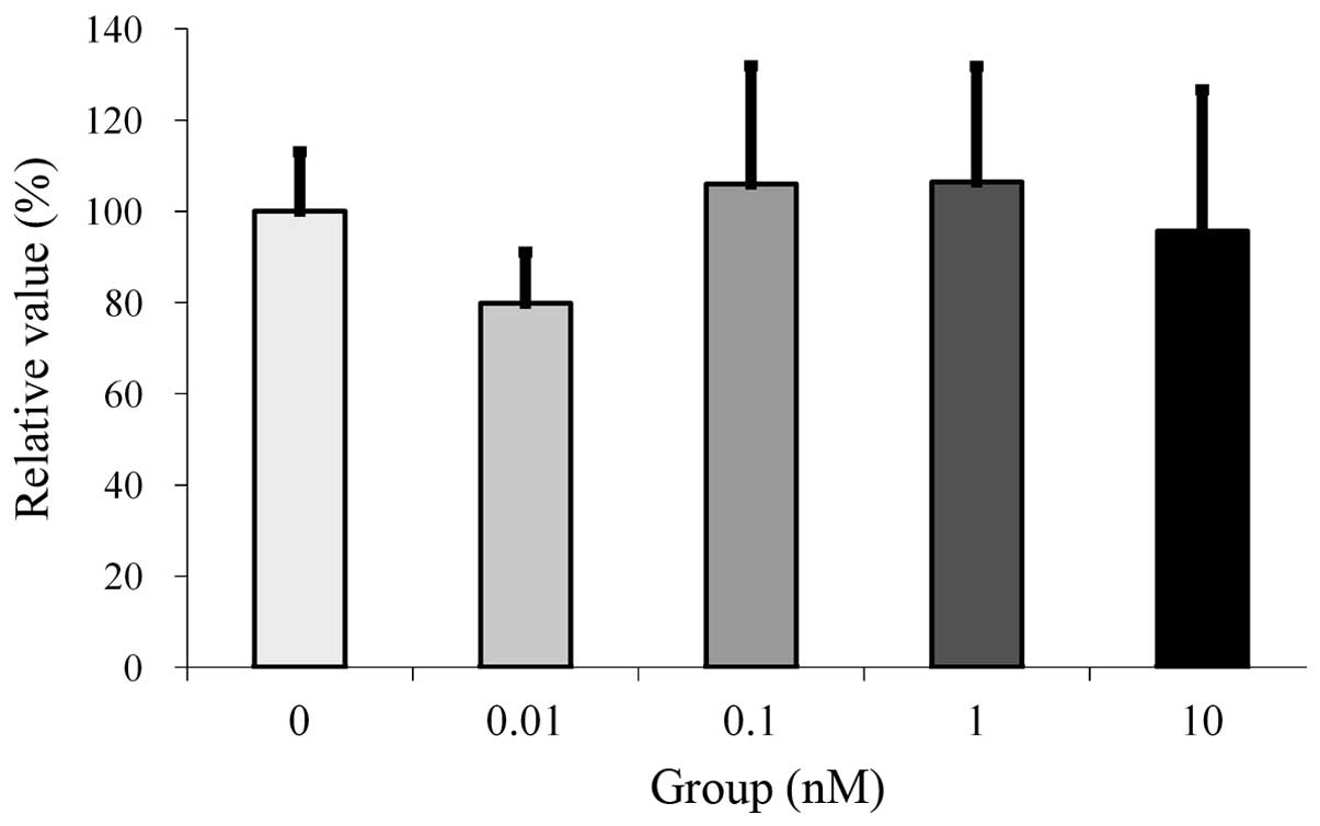 MTT assays were used in the present study to evaluate cellular proliferation since this assay allows mitochondrial dehydrogenases to oxidize MTT to an insoluble blue formazan product (9,10). The results indicated that although there were increases in the relative values, they were not significant increases, suggesting that cellular proliferation was not affected by the treatment. Previous studies have demonstrated that estrone at a concentration of 10 nM markedly stimulated the proliferation of human breast epithelial HBL-100 cells and that estrone at concentrations of 10 and 100 nM significantly promoted the proliferation and survival of human osteoblastic MG-63 cells (8). This difference in results may be due to the expression of large amounts of ER-α and ER-β, which are responsive to estrogen, in MG-63 cells (11).