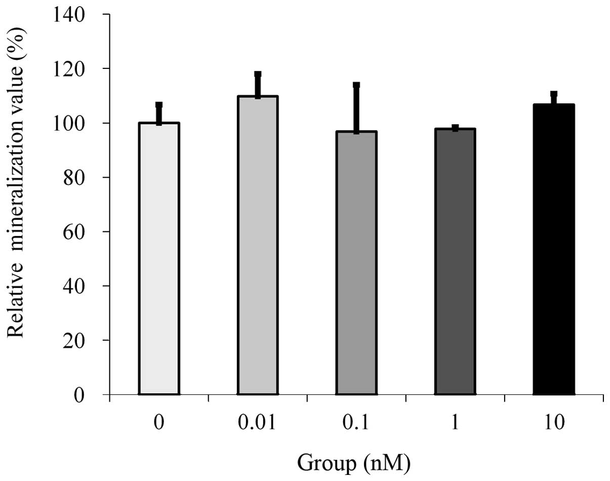 Osteoblast differentiation was assessed by ALP activity, which has been reported to be an early marker of osteoblastic cell differentiation (12,13). The results of the present study revealed that estrone demonstrated no significant effects within the range of administered doses. In MG-63 cells, estrone at 100 nM concentration has been demonstrated to markedly increase ALP activity (11). The presence of calcium deposits was evaluated using alizarin red S staining with the aid of cetylpyridinium chloride for quantification (14). Although treatment with estrone at higher concentrations demonstrated a tendency to increase the calcium levels of cellular deposits, this did not reach a statistically significant level. The difference in differentiation and mineralization behavior with regard to the estrone dosage may be attributed to the type of cells, system model, the culturing period or different affinity for ERs (8,15).