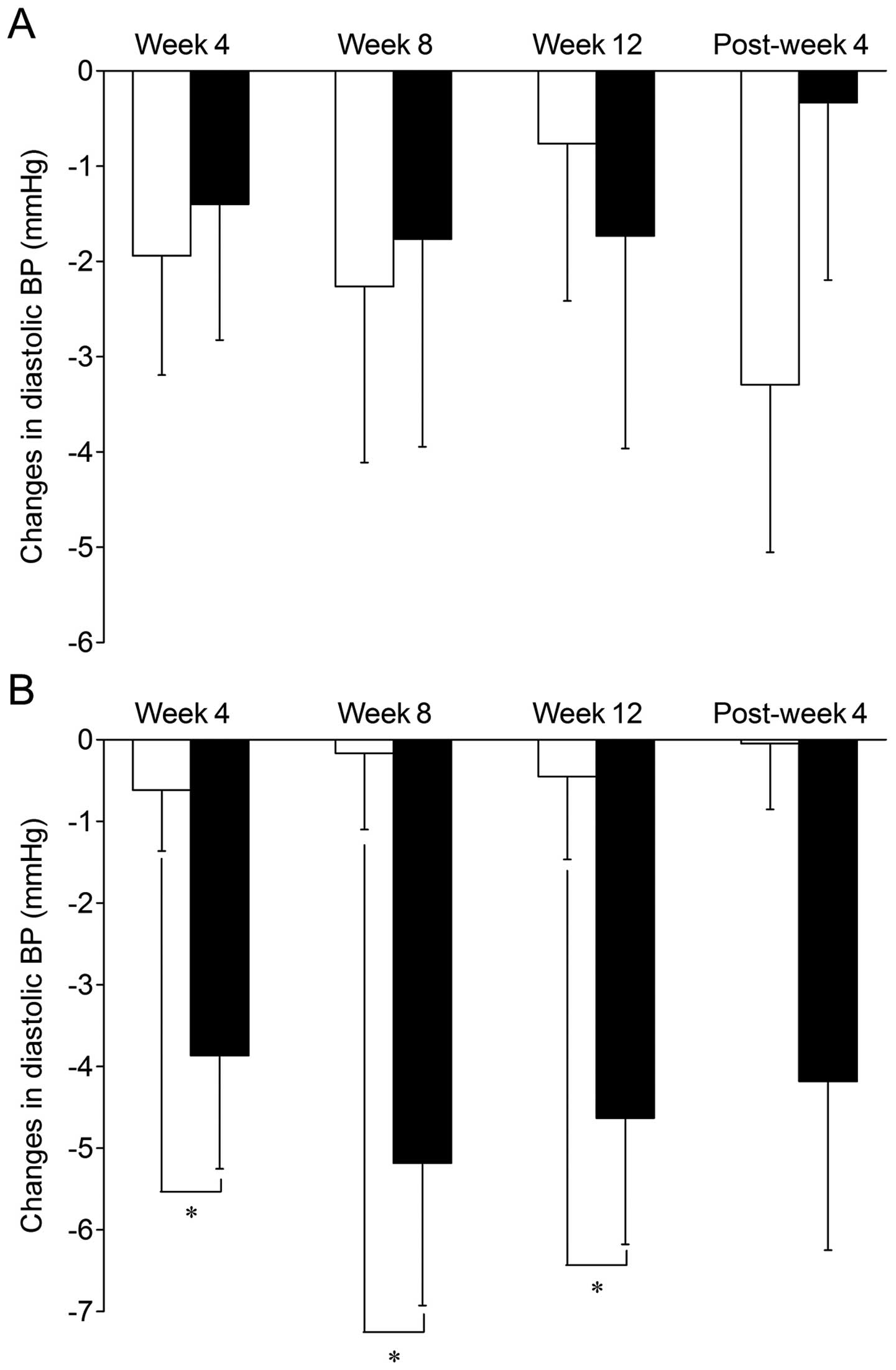In conclusion, the results of the present study have demonstrated that a daily 300-mg as dehydrated garlic homogenate dose of the GH diet lowered systolic BP by 6.6–7.5 mmHg and diastolic BP by 4.6–5.2 mmHg in subjects with mild hypertension, but not in those with prehypertension, following an 8- or 12-week treatment. The substantial hypotensive effects of the GH diet appeared to continue for at least 4 weeks following the termination of the 12-week treatment. The GH diet was well tolerated without any clinically significant untoward effects. These results lead us to the conclusion that GH diet may have certain benefits as a complementary therapy for mildly hypertensive subjects.