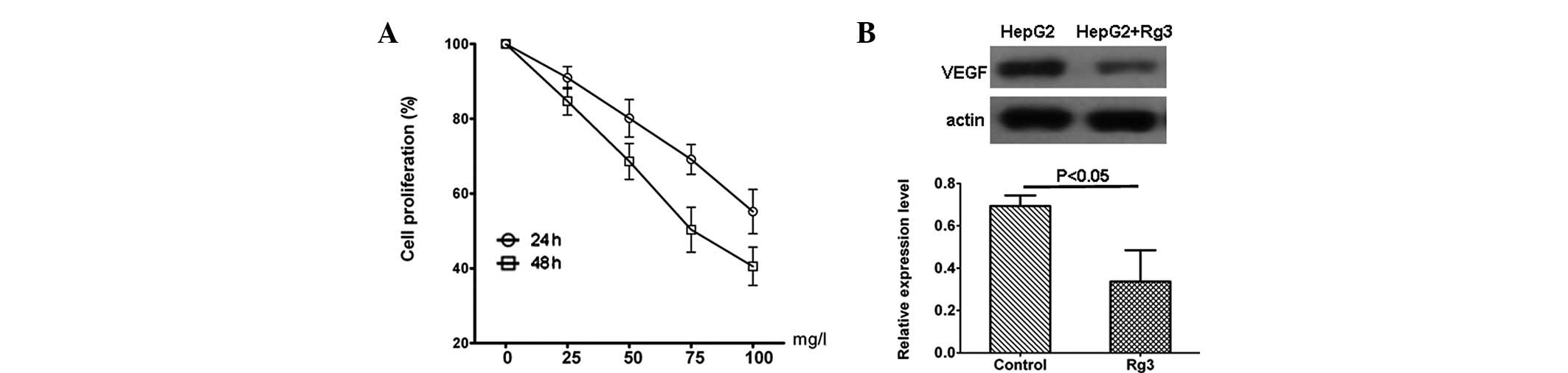 To determine whether Rg3 functions as a novel chemotherapeutic agent for human hepatocellular carcinoma, we first examined the effect of Rg3 on the proliferative activity of human hepatocellular carcinoma cells. As shown in Fig. 1A, the proliferation of human hepatocellular carcinoma cell line HepG2 was inhibited by Rg3 in a concentration-dependent manner in vitro. In addition, western blotting results indicated that Rg3 inhibited the VEGF expression of HepG2 cells significantly (P<0.05; Fig. 1B).