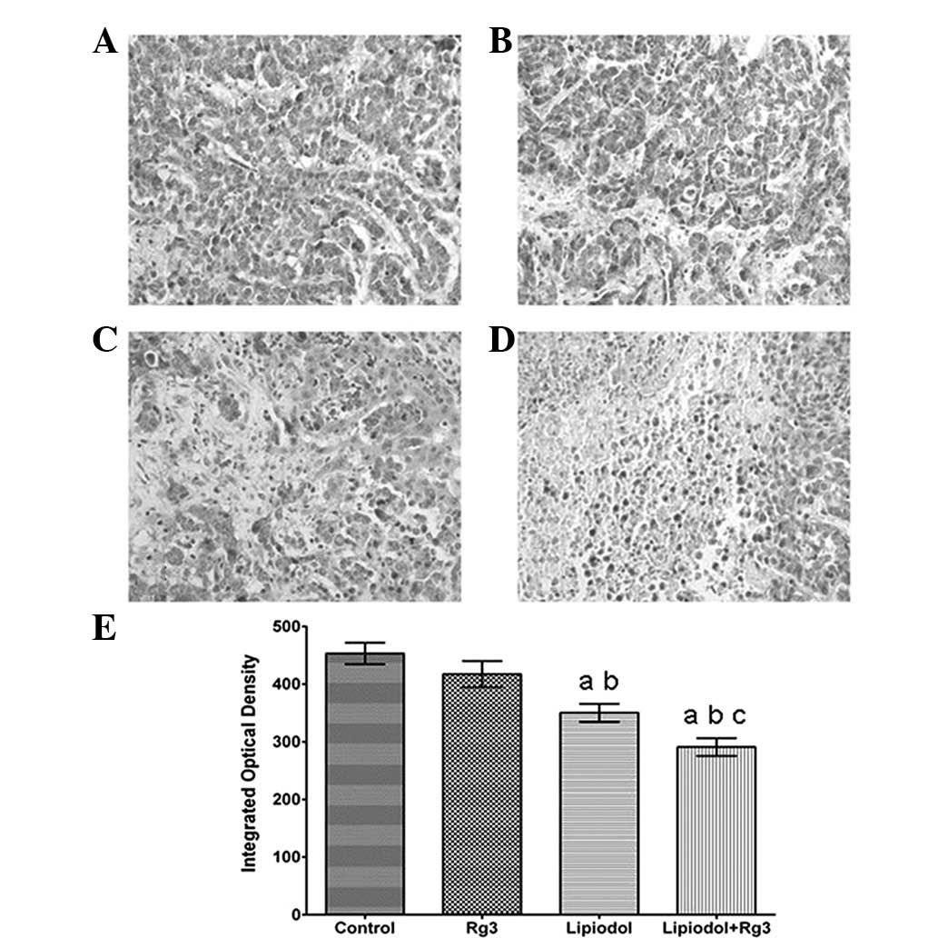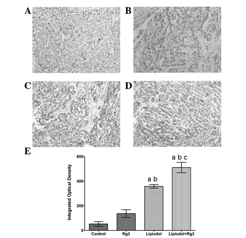 The most prominent constituents of ginseng, a traditional Chinese medicinal herb, are ginsenosides. Thus far, over 40 types of ginsenosides have been isolated and have been demonstrated to affect the central nervous system and immune system, thereby producing anti-stress, anti-ageing, anti-fatigue, anti-hyperlipemic and anti-angiogenic effects (9–12). Of all ginsenosides isolated from ginseng, ginsenoside Rg3 has gained much attention for its antitumor properties (13). Previous studies have shown that Rg3 may inhibit cancer cell proliferation, inhibit metastasis, promote cancer cell apoptosis and enhance immunity (14–17). Kim et al demonstrated that chemotherapeutics combined with Rg3 may have enhanced therapeutic efficacy and reduced side-effects (18). At present, the oral administration of Rg3 is employed by physicians worldwide. However, the therapeutic effect of Rg3 when administered selectively via an artery has not been investigated.