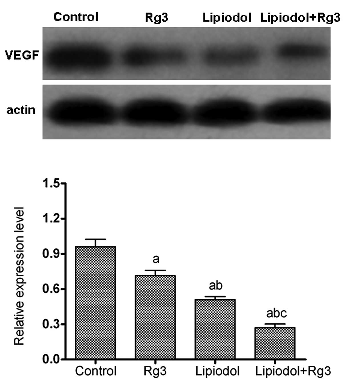 Immunohistochemical analysis demonstrated that the tumor tissues were weakly stained for VEGF (Fig. 2) and CD31 (Fig. 3) antibody in Group 2 (TAE) and particularly weakly in Group 3 (Rg3 and TAE) compared with Group 1 (Rg3) and the control. Groups 2 (TAE) and 3 (Rg3 and TAE) each had a significantly lower integrated optical density (Fig. 2E and Fig. 3E) than the other groups. Group 1 (Rg3) also had a lower integrated optical density than the control group, however, there was no significant difference between the two groups. A western blot analysis of VEGF (Fig. 4) showed similar results to those of the immunohistochemical analysis. The mean relative protein expression of VEGF was 0.95±0.10, 0.71±0.07, 0.50±0.08 and 0.26±0.04 in the control group, Rg3 group, lipiodol group and lipiodol + Rg3 group, respectively (Fig. 4). The expression level of VEGF in the group treated with TAE and Rg3 was significantly decreased compared with that in the other groups (P<0.05; Fig. 4).