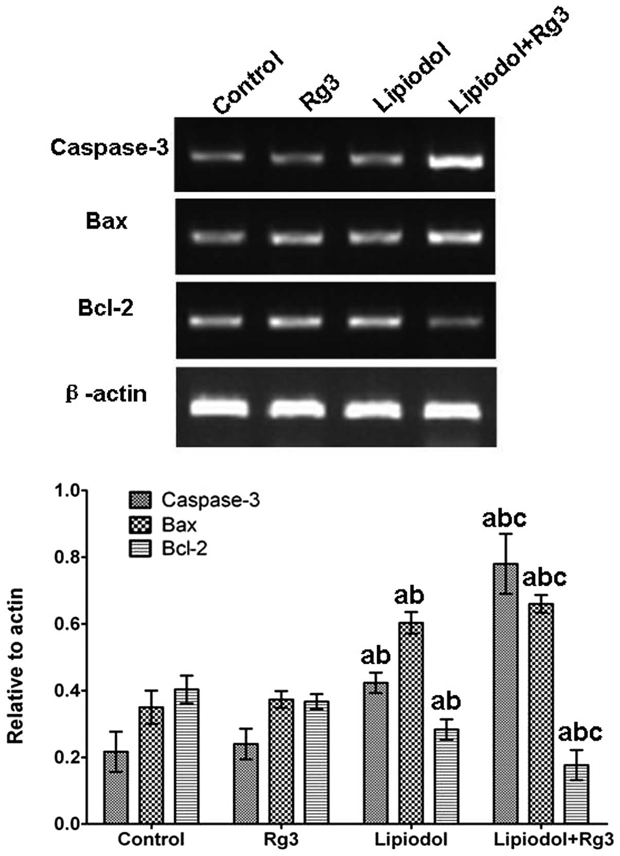 Tumor tissues were rapidly excised and powdered in liquid nitrogen. Total RNA was extracted using TRIzol (Invitrogen, Carlsbad, CA, USA) according to the manufacturer’s instructions. For semi-quantitative RT-PCR, cDNA synthesis and PCR analysis were performed using the RevertAid™ First Strand cDNA Synthesis kit (Fermentas, Thermo Fisher Scientific Inc., Waltham, MA, USA). PCR was performed using an Eppendorf Mastercycler gradient thermal cycler (Eppendorf, Hamburg, Germany). The reaction cycle consisted of a hot start at 95°C for 10 min, then 30 cycles of denaturation at 95°C for 30 sec, annealing at 60°C for 30 sec and extension at 72°C for 30 sec. The primer sequences used for PCR were as follows: β-actin: 5′- C T T C CAG C C C T C C T T C C T - 3 ′ and 5′-GCCCGACTCGTCATACTCC-3′ (product size: 316 bp); caspase-3: 5′- CAATGGACTCTGGGAAAT-3′ and 5′-GCAAGCCTGAATAATGA-3′ (product size: 489 bp); Bax: 5′-CCAAGAAGCTGAGCGAGTG-3′ and 5′-TTCCAG ATGGTGAGTGAGG-3′ (product size: 400 bp); and Bcl-2: 5′-GTGGGATACTGGAGATGAAGA-3′ and 5′-GACGGT AGCGACGAG AGA-3′ (product size: 233 bp). Experiments were performed in triplicate in three independent experiments.