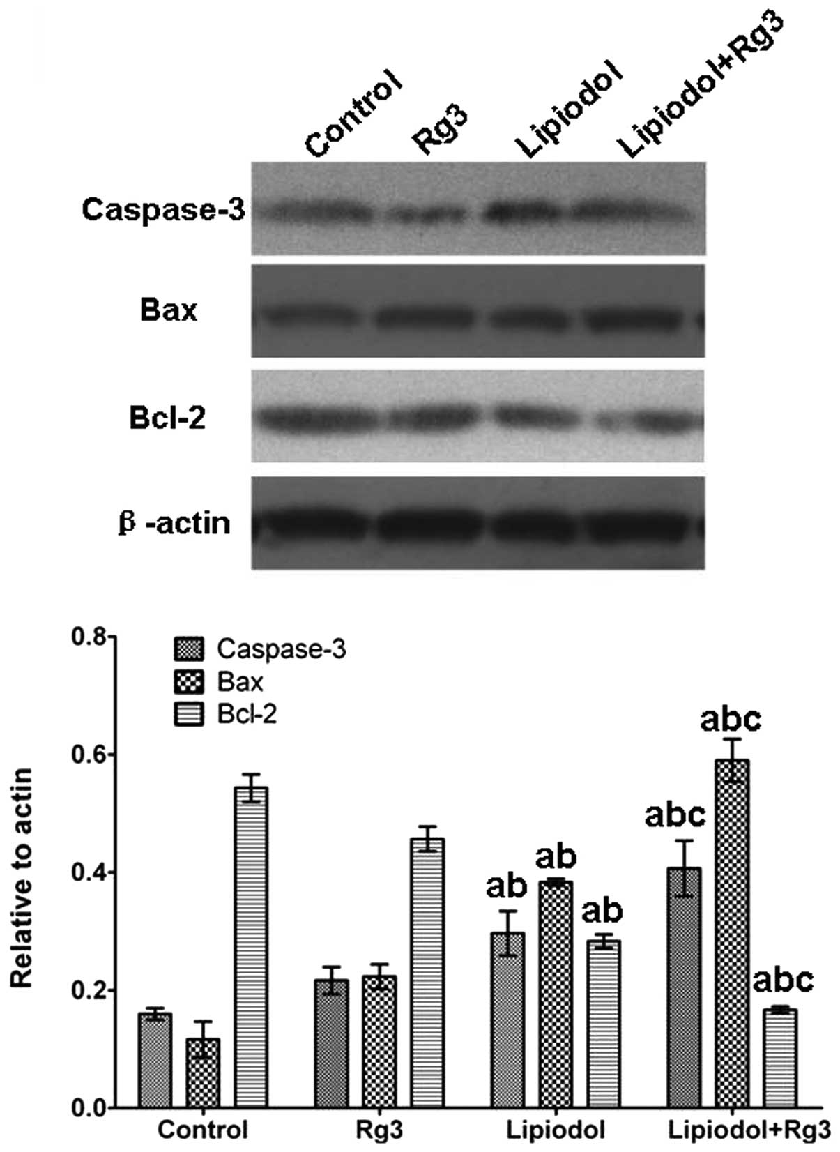 Immunohistochemistry and western blot analysis demonstrated that VEGF and CD31 expression in Groups 2 (TAE) and 3 (Rg3 and TAE) was significantly lower than in the control group. Group 3 (Rg3 and TAE) displayed a lower VEGF and CD31 expression than Group 2 (TAE). These results indicate that Rg3 may inhibit angiogenesis following TAE. Previous studies have indicated that TAE enhances tumor hypoxia, which upregulates the expression of VEGF (1–3). Notably, in the present study, the VEGF expression was significantly downregulated in the group treated with TAE compared with the control group. This may be due to the TAE therapy causing the necrosis and shrinkage of tumors. The results of histological and morphological examination were also confirmed by the necrosis or apoptosis of tumor cells observed in the group treated with TAE. A previous study has shown that the rate of cancer cell proliferation and apoptosis is closely correlated with the progression of cancer (21), therefore, pro-apoptotic and anti-apoptotic genes were monitored in order to evaluate the antitumor and anti-angiogenic activity of Rg3 and TAE. The results of the present study showed that TAE alone and hepatic arterial administration of Rg3 in combination with TAE may downregulate the Bcl-2 expression and upregulate the caspase-3 and Bax expression significantly. Compared with TAE monotherapy, there was a significantly lower Bcl-2 expression and higher caspase-3 and Bax expression in Group 3 (Rg3 and TAE). These results suggest that selective hepatic arterial administration of Rg3 in combination with TAE may significantly inhibit tumor cell proliferation and promote tumor cell apoptosis through a caspase-dependent mechanism.