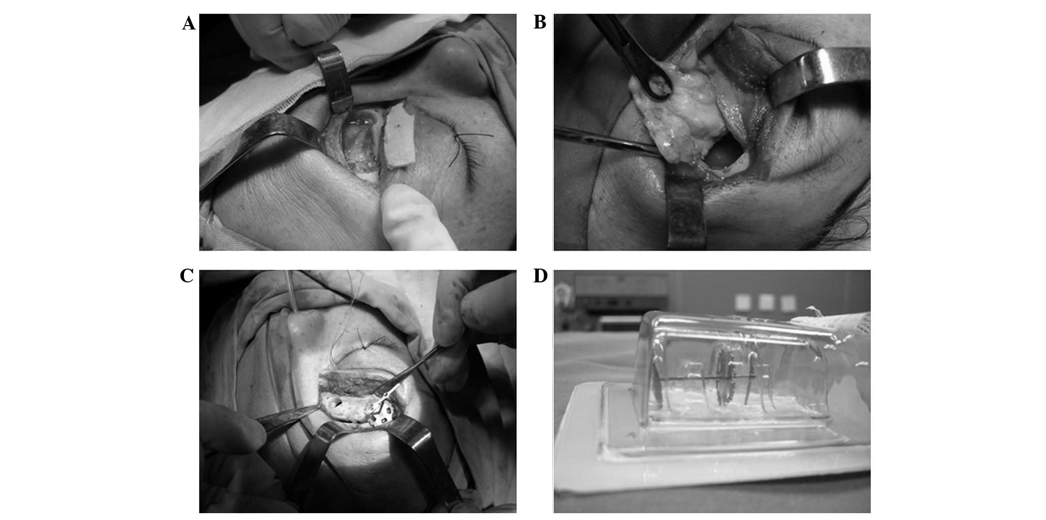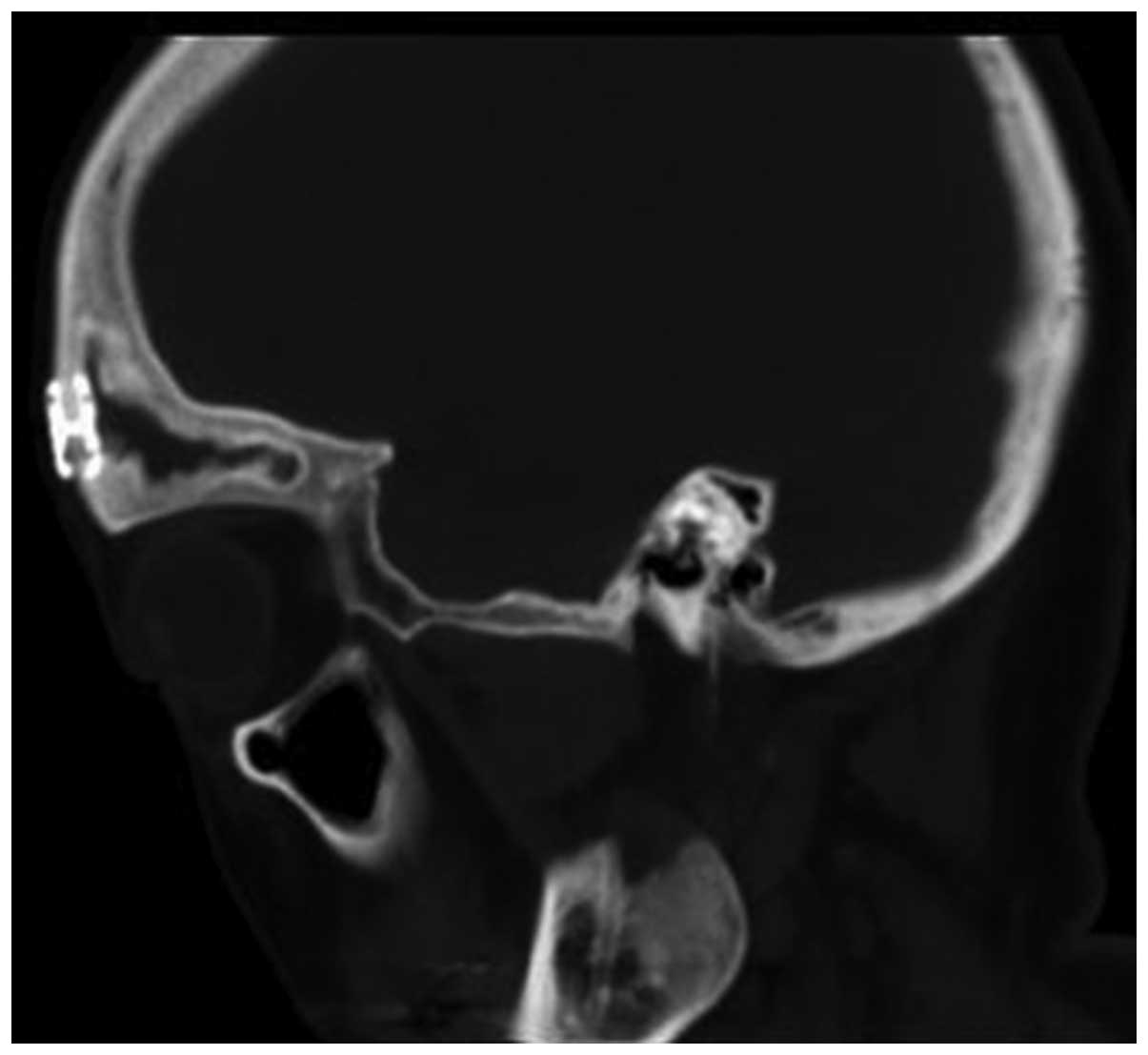 Ossifying fibroma in the nasal cavity and paranasal sinus is a benign tumor histologically, but in the clinic it has invasive characteristics. It usually invades the eye socket, the base of the skulland calvarium to induce symptoms in the eye and brain, and its malignancy rate is 0.4–0.5% (4). Furthermore, it is mainly induced due to repetitive surgery or chemotherapy. Therefore, there is only one effective treatment method: an early surgery for complete tumor resection. There are many approaches to the surgery, and the most suitable approach is generally determined according to the lesion range (5). For lesions that occur only in the maxillary sinus, the selection of the Caldwell-Luc approach for conducting a maxillary sinus radical operation is appropriate. For lesions that occur in the anterior ethmoid sinus, frontal sinus and sphenoid sinus, the selection of a lateral rhinotomy or an extended lateral rhinotomy is appropriate. For cases with a wide lesion range and with tumor invasion of the base of the skulland other important sites, it is feasible to use a combined craniofacial approach for the complete resection of the tumor. Some investigators believe that as the tumor invasion site is critical and the surgical risk is high, it is necessary to conduct a partial resection of the tumor to ensure the function of vital organs (6).