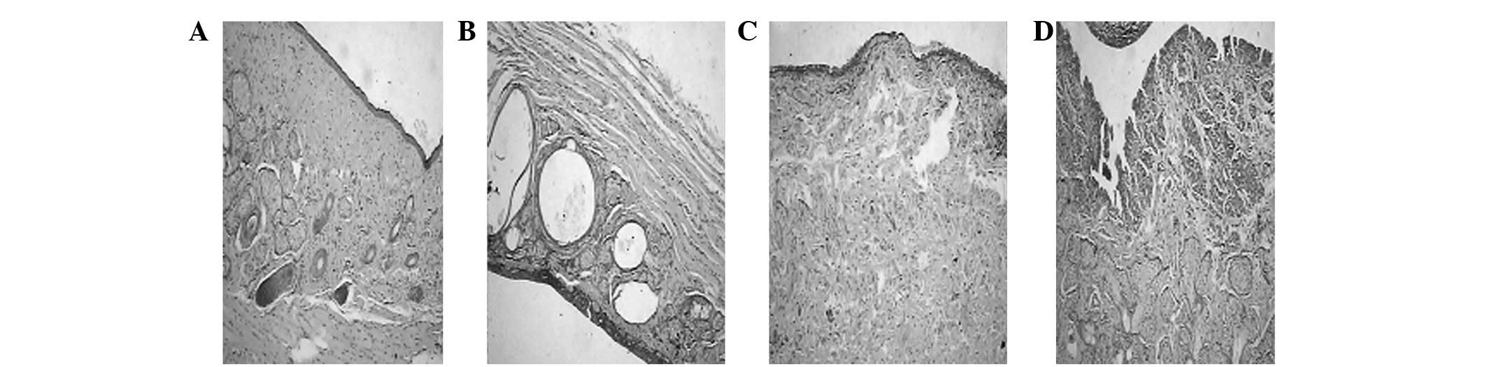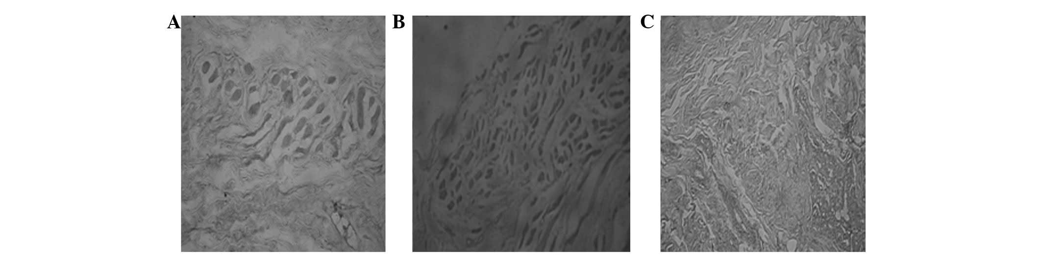 Three groups of stained specimens were observed by microscopy. During the first week, inflammatory infiltration, necrosis and gland necrosis were detected among them. Inflammatory infiltration disappeared within the first month. Collagen fiber and connective tissue hyperplasia were eventually observed. Three months later, inflammatory cells completely disappeared, but collagen fiber hyperplasia emerged. Milder inflammatory infiltration and less necrosis were observed in Group 1 in the early stage compared with the other two groups, but a number of gland cells did not survive. Group 1 also exhibited milder connective hyperplasia during the late period (Fig. 1).