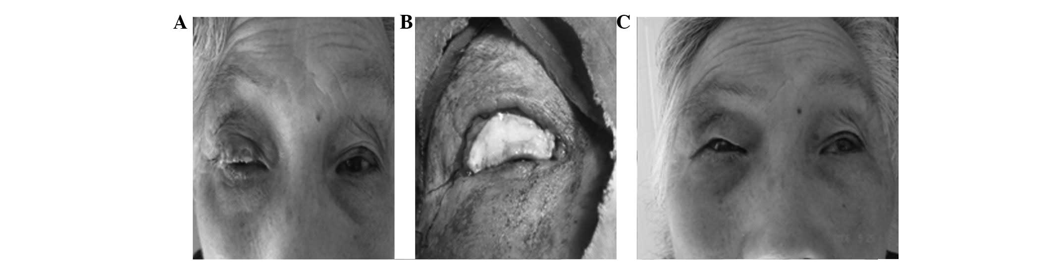 Eyelid subcutaneous tissues were collected and fornices with tissue infiltration were injected with anesthesia (2% lidocaine and 0.75% bupivacaine). Neoplasms were excised beyond 4–5 mm of their exterior. Rapidly frozen slices were subjected to pathological examination. If the tissue of a slice margin was considered normal, palpebral conjunctival transplantation was initiated. The tarsal palpebral conjunctivae, along with the eyelashes, were trimmed into the size and shape that were required. They were then sutured with the original tarsal stump or internal and external palpebral periorbital ligaments. If the case involved a superior tarsal defect, we kept the levator palpebrae superioris fixed on the upper eyelid margin. Palpebral conjunctivae were closed with an interrupted suture. Transferring or sliding the musculocutaneous flap can reconstruct skin defects. The correct tension was applied to avoid entropion and ectropion of the eyelids postoperatively. Dressings were postoperatively changed once to twice a day and pressed for 5 days. Local and general anti-biotics were used. Xibrom was applied to local sites. Stitches were removed 2 weeks postsurgery.