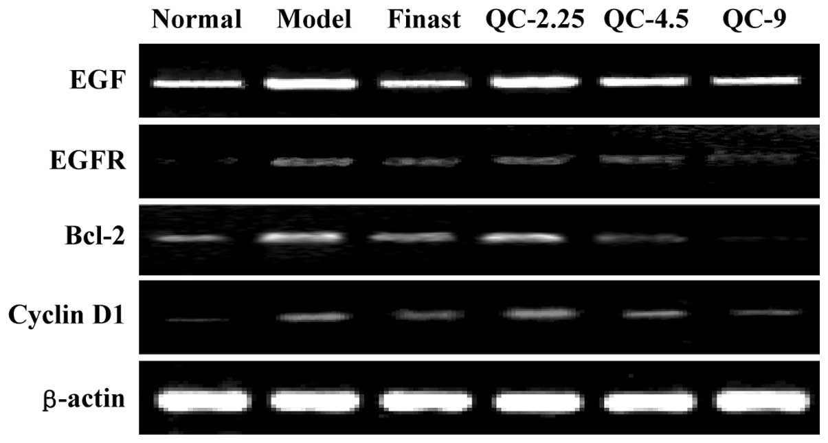 QC (Fujian, China, FDA approval No.: Z09104065) is a capsule of five Chinese products, as listed in Table I, that was provided by the Academy of Pharmacology of Fujian University of Traditional Chinese Medicine. The drug powder inside the capsule was dissolved in distilled water and stored at 4°C. Testosterone propionate injection solution (25 mg/ml) was obtained from Shanghai GM Pharmaceutical Co., Ltd. (Shanghai, China; batch number: H31020524). Finasteride was obtained from Merck (Hangzhou, China; batch number: J20050041). TRIzol reagent was purchased from Invitrogen (Carlsbad, CA, USA). SuperScript II reverse transcriptase was obtained from Promega (Madison, WI, USA). Rat EGF ELISA kit was obtained from Shanghai Xitang Biological Technology Ltd. (Shanghai, China). EGF, EGFR, p-STAT3, Bcl-2 and cyclin D1 primary antibodies, secondary antibody, streptavidin-peroxidase (SP) and 3,3’-diaminobenzidine (DAB) were purchased from Bohai Biotechnology Development Co., Ltd. (Shijiazhuang, China). All other chemicals, unless otherwise stated, were obtained from Sigma-Aldrich (St. Louis, MO, USA).