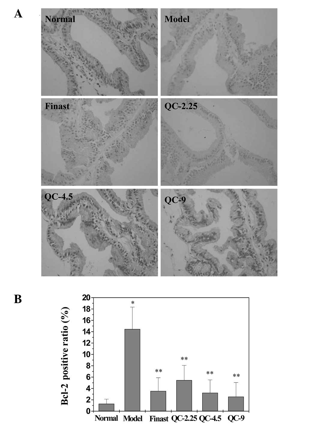 STAT3 phosphorylation in the prostatic tissue of BPH rats was determined using an IHC assay. As shown in Fig. 7, the positive expression level of phosphorylated STAT3 (p-STAT3) in the model group was markedly increased compared with that in the normal group (P<0.05), but treatment with finasteride or QC significantly inhibited the effect of BPH model construction on the STAT3 phosphorylation. The expression of cyclin D1 and Bcl-2, two important target genes of STAT3 pathway, was also detected by RT-PCR and IHC analysis. As shown in Figs. 3, 8 and 9, finasteride or QC treatment profoundly inhibited the expression of cyclin D1 and Bcl-2 induced by the construction of the BPH model, at the transcriptional and translational levels.