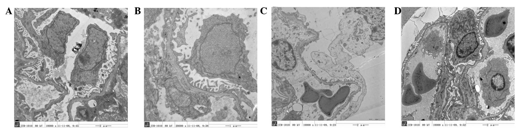 A specimen was cut into ultra-thin sections of 60–68 nm. A JEM-1010 model transmission electron microscope was used to observe the ultra-microstructures of the renal capsule, renal glomerulus and renal tubule. At the same time, images were captured.