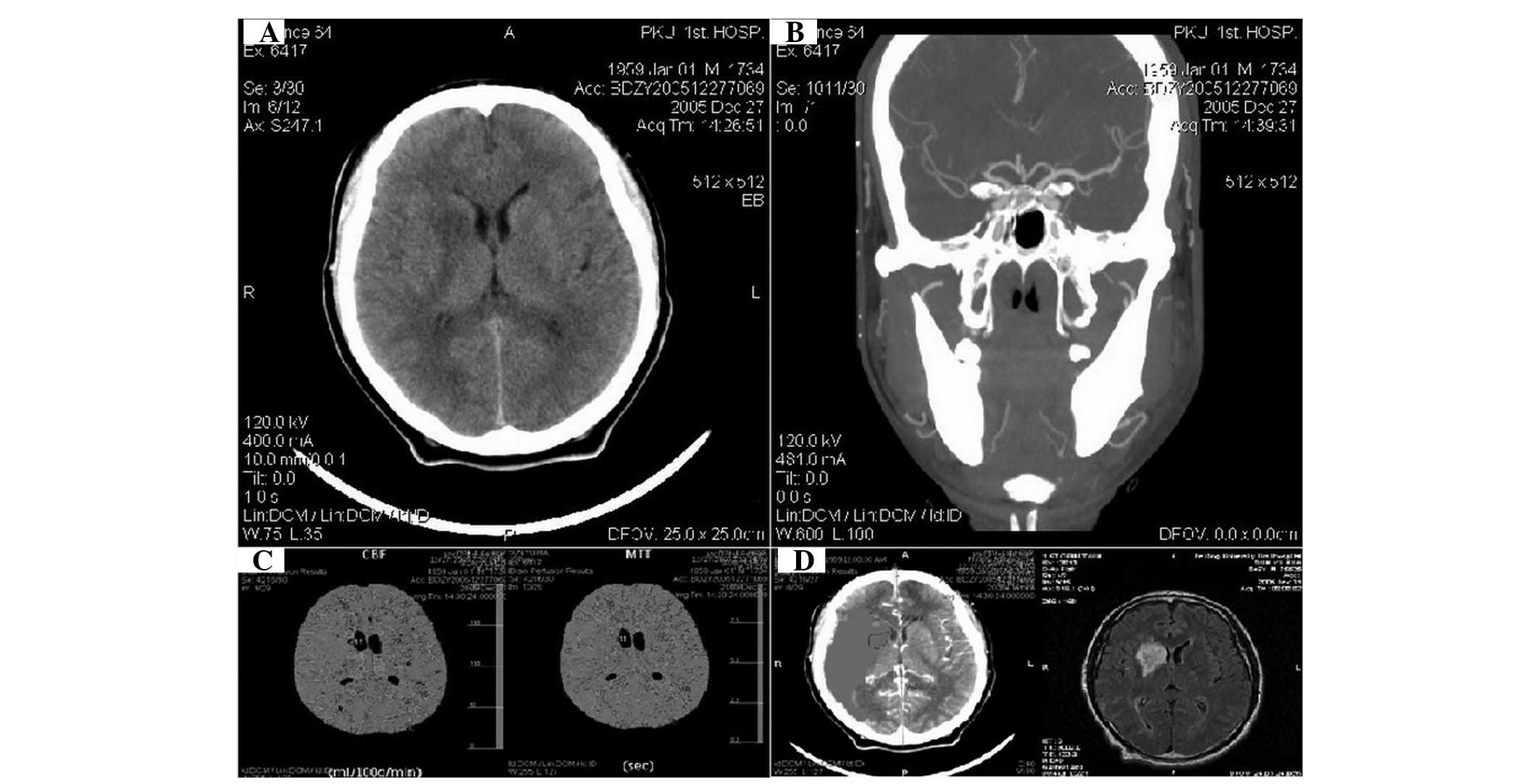 A total of 22 patients with neurological deficit symptoms and with intracerebral hemorrhage ruled out using a CT scan, who were admitted to the Emergency Department of Neurology of Peking University First Hospital (Beijing, China) from August 2005 to June 2006, were retrospectively studied. This study was conducted in accordance with the Declaration of Helsinki and with approval from the Ethics Committee of Peking University First Hospital. Written informed consent was obtained from all participants. Inclusion criteria for the patients were as follows: within 24 h of stroke onset; no previous history of stroke; intracranial hemorrhage determined using a CT scan; and no contraindications of imaging using iodinated contrast agent and contraindications of MRI examination. Of the 22 patients, 13 were male and 9 were female, aged 42–73 years, with a mean age of 56.7 years. The symptoms of the patients manifested as transient, persistent or recurrent ischemic attacks. Of the 22 cases, 8 patients presented episodic limb weakness, 6 patients had dysphonia, 4 patients presented tongue deflection, 2 patients presented dysphonia and unresponsiveness and 2 patients presented aphasia combined with unilateral hemiparesis. All patients received a plain CT scan and the results were confirmed by CTPI and CT angiography (CTA) at 1–24 h after the onset of the disease. All the selected cases underwent MRI examination within 3–10 days of the onset of the disease. This identified that the infarct areas were larger than the range observed during perfusion.