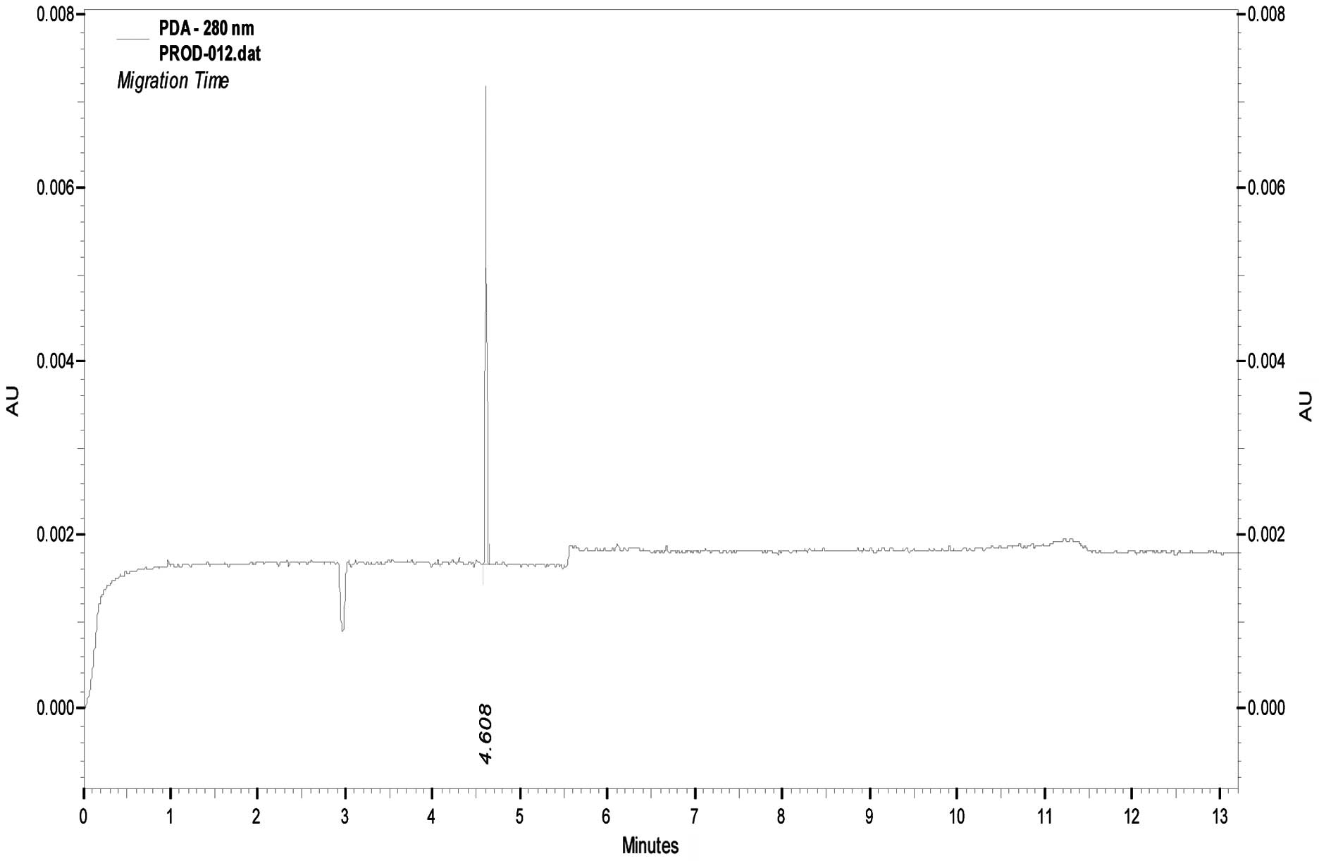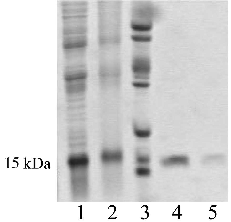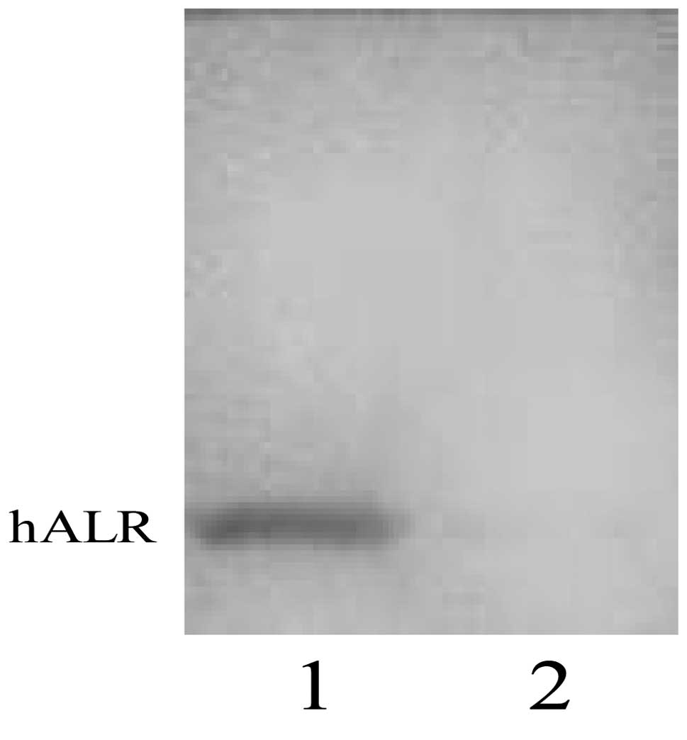 The recombinant plasmid pQE30-hALR showed high expression in the host bacteria and the molecular weight of the product was approximately 15 kDa (Fig. 1). Following purification with affinity chromatography, the protein was identified as one band by SDS-PAGE with a purity of 90% by CE (Fig. 2).
