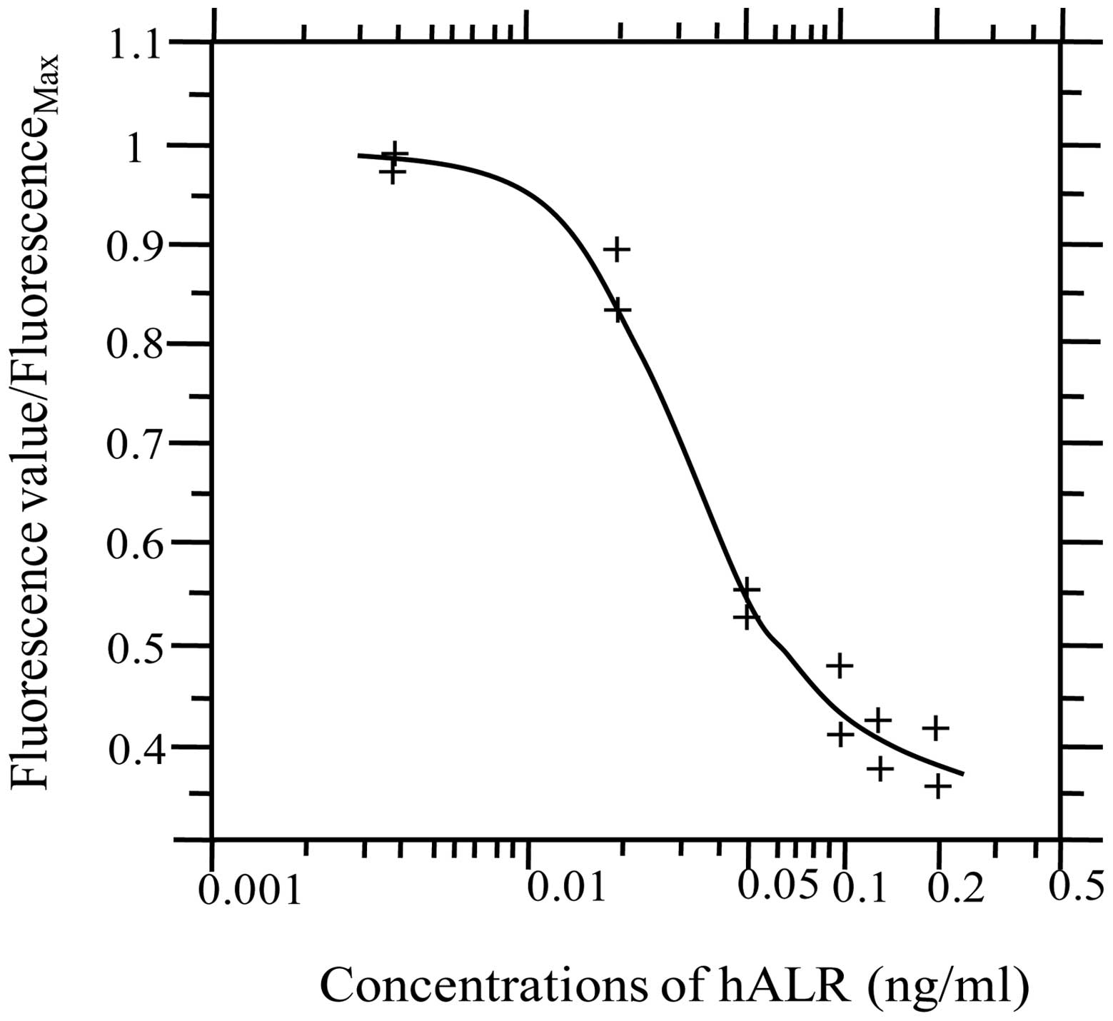 A standard curve for competitive inhibition of Eu3+-hALR and hALR was constructed. The fluorescence values of standard hALR and Eu3+-ALR at various concentrations were measured by TRF. A standard curve was constructed using matched software (Sym-Bio Life Science, Zhejiang, China), with the concentration of standard hALR on the x-axis and the ratio of fluorescence value in reaction wells/measured maximal fluorescence value on the y-axis, as shown in Fig. 4.