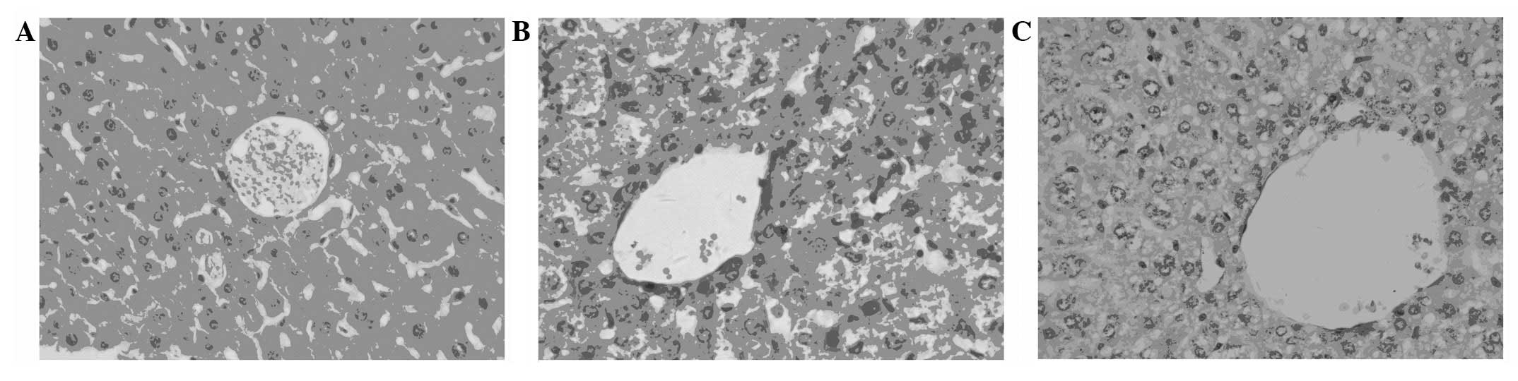 The liver samples were thawed, weighed and homogenized at a ratio of 1:9 (w/v) in a 0.9% saline solution. The homogenate was then centrifuged at 1,600 × g for 10 min at 4°C. The levels of SP in the supernatant were measured using a mouse SP ELISA kit according to the manufacturer’s instructions. A 96-well microplate was loaded with 25 μl primary antibody specific for rat SP. Aliquots of 50 μl each sample and 50 μl standard SP dilutions (as a control) were mixed in the assigned wells in duplicate, followed by the addition of biotinylated SP to each well, with the exception of the blank control. The plate was incubated for 2 h at room temperature and then washed six times with the wash buffer provided in the kit. Subsequently, 100 μl biotinylated anti-SP antibody solution was added and the plate was incubated for 1 h and then washed four times. Then, 100 μl streptavidinhorseradish peroxidase conjugate solution was added to each well, with the exception of the chromogen blank, and the plates were incubated for 1 h and washed again. After washing, 100 μl substrate solution provided in the kit was added to each well and the plates were incubated for 1 h at room temperature. The reaction was stopped with 2 mol/l HCl and the optical density values were read at 492 nm. The concentration of SP was expressed in pg/ml.