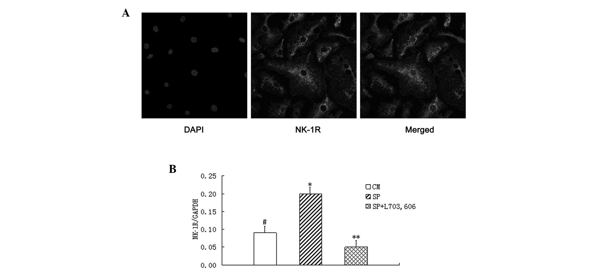 Cells (5×104) were placed on poly-L-lysine-coated slides in 200 μl media, fixed with 4% paraformaldehyde, washed three times in 0.1 M PBS, blocked with serum-free protein and permeabilized using 0.4% Triton X-100. The fixed cells were incubated overnight at 4°C with the NK-1R antibody NB300-101 (1:50), then subjected to PBS washes and incubation with rabbit anti-NK-1R secondary antibody (1:500) for 1 h at room temperature. Then, the sections were washed in PBS and mounted with 4′,6-diamidino-2-phenylindole (DAPI)-containing mounting medium (Vector Laboratories, Burlingame, CA, USA). Images were acquired by laser scanning confocal microscopy (LSM710; Carl Zeiss, Oberkochen, Germany) and analyzed using Image Pro Plus 6.0 (Media Cybernetics Rockville, MD, USA).