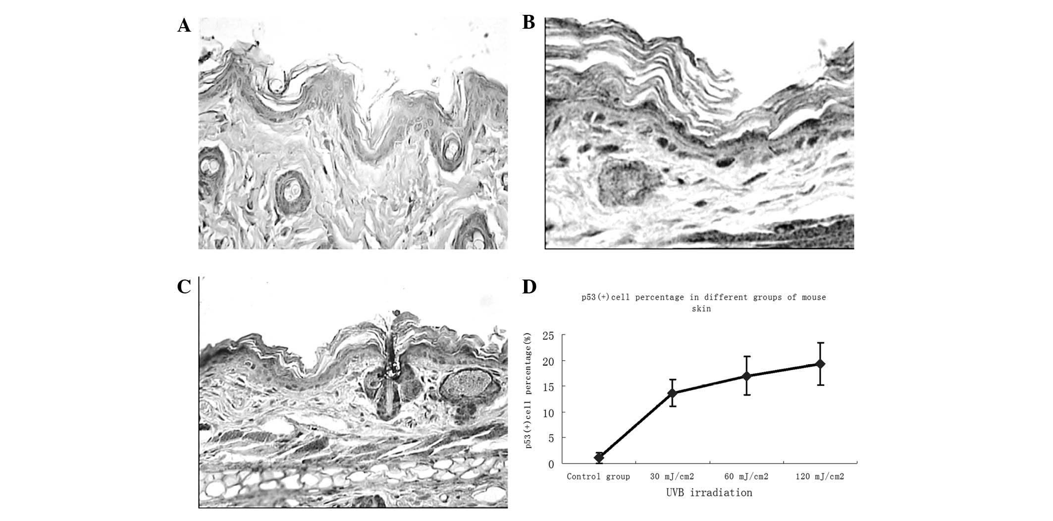 The sections were treated with 0.01 M sodium citrate buffer, prior to incubation with primary antibodies against p53 (Santa Cruz Biotechnology, Inc.) and incubation in a moist chamber overnight at 4°C. After being washed in phosphate-buffered saline (PBS), the sections were incubated in secondary antibody, immunoglobulin (Ig)G, for 20 min and then were incubated with the streptavidin-biotin-peroxidase complex (SABC) and 3,3′-diaminobenzidine (DAB) substrate solution, respectively. Subsequently, the slides were counterstained with hematoxylin and observed under a light microscope. A positive result was shown as a light to dark brown staining/precipitate in the nuclei of the cells. The p53+ nuclei in the epidermis among each 200 basal cells were counted in 10 randomly selected visual fields at ×400 magnification.
