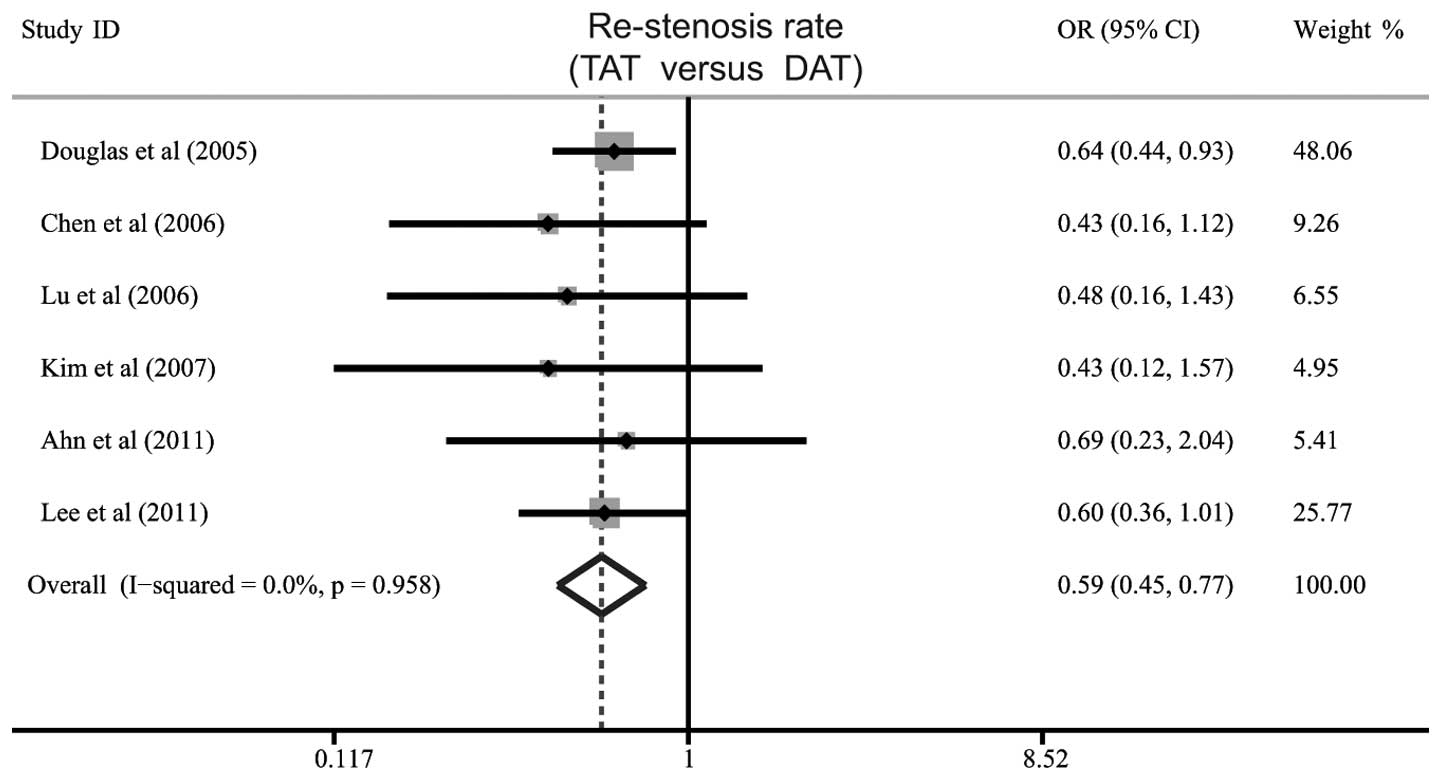 Six studies identified a difference in the rate of restenosis between TAT and DAT for patients with CHD undergoing PCI. The heterogeneity was not significant (P=0.958, I2=0%), therefore, the fixed effects model was used. The meta-analysis results showed that patients in the TAT group had a significantly lower rate of restenosis than those in the DAT group (OR=0.59, 95% CI: 0.45–0.77, P<0.001; Fig. 2).