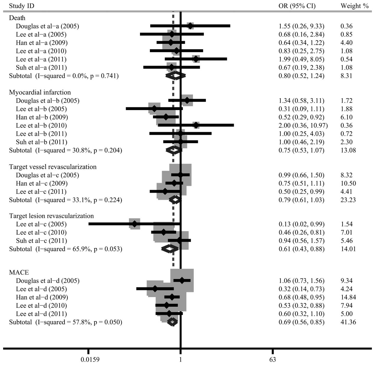 Using a standardized form, data from published studies were extracted independently by two authors. For each study, the following characteristics and numbers were collected: the authors, year of publication, country, ethnicity, study design, number of subjects, follow-up period, antiplatelet drug and dose, rate of restenosis and clinical events [major adverse cardiac events (MACE) and stent thrombosis]. MACE included mortality rate, MI, target lesion revascularization (TLR) and target vessel revascularization (TVR). In cases of conflicting evaluations, two authors discussed the issue in order to meet a consensus; if no agreement was reached, a third author decided.