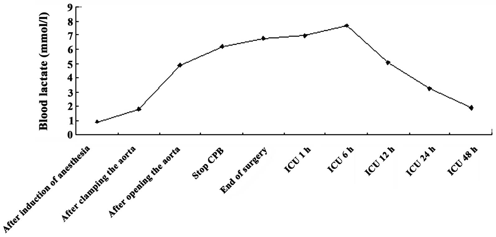 During surgery, after aortic cross-clamping, blood lactate levels increased gradually with increasing surgery time. The mean arterial (aorta) blood lactate level was >4.88 mmol/l and lactic acidosis was observed. Following aortic stop flow infusion and CPB, blood lactic acid levels continued to rise significantly in a linear manner. The peak intraoperative blood lactate level occurred at the end of surgery.