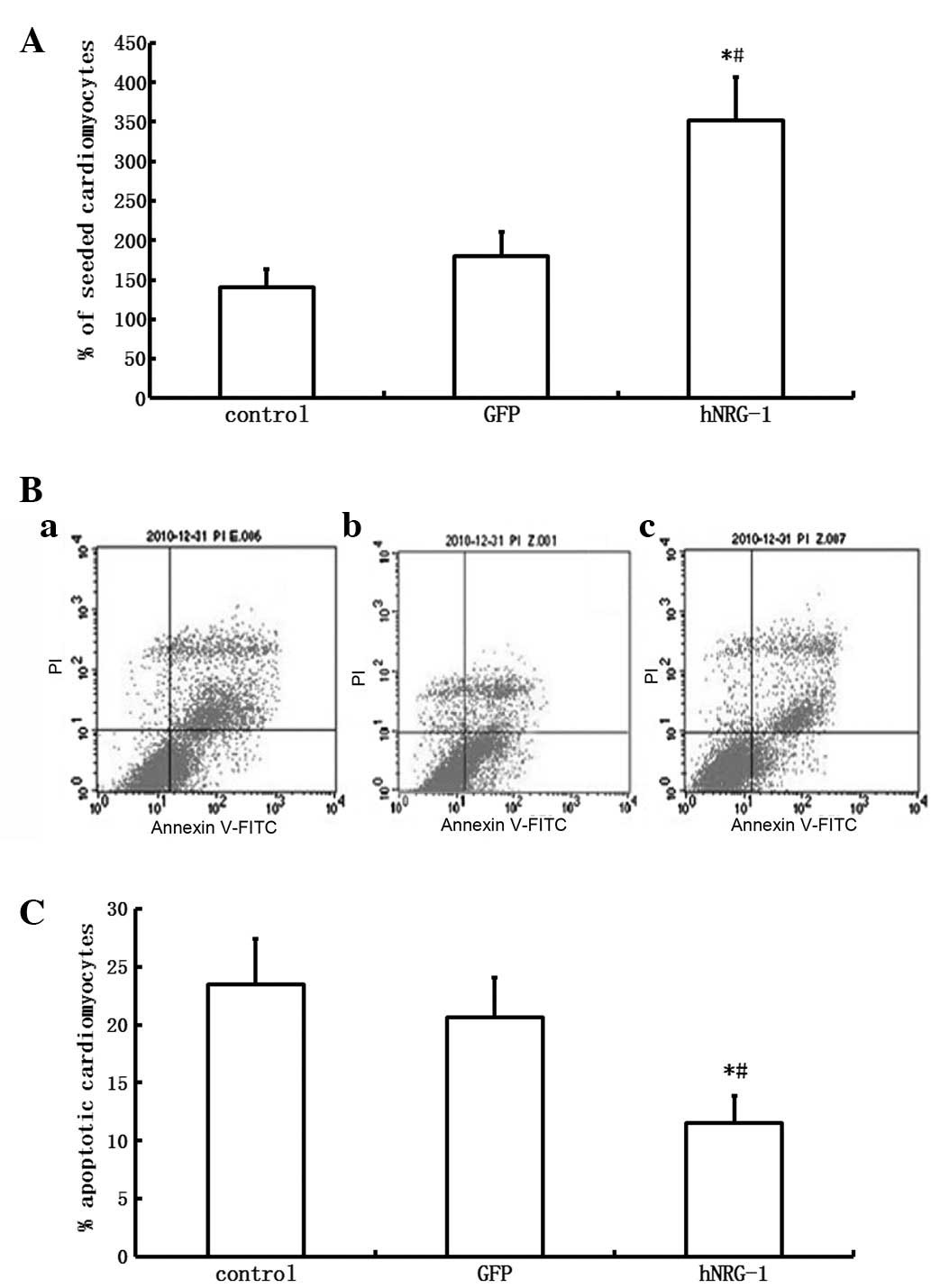 Cardiomyocytes were plated into 12-well dishes at a cell density of 2×104/well and randomly allocated into three groups. The cells in group A were cultured in fresh DMEM/20% FBS (control); the cells in group B were cultured in 50% fresh DMEM/20% FBS and 50% the medium previously harvested from GFP-CMECs; and the cells in group C were cultured in 50% fresh DMEM/20% FBS and 50% the medium previously harvested from hNRG-1-CMECs. After 3 days of culture, some wells of cardiomyocytes in each group were counted. The number of cardiomyocytes was independently determined by investigators blinded to the type of cell culture using a hemacytometer.