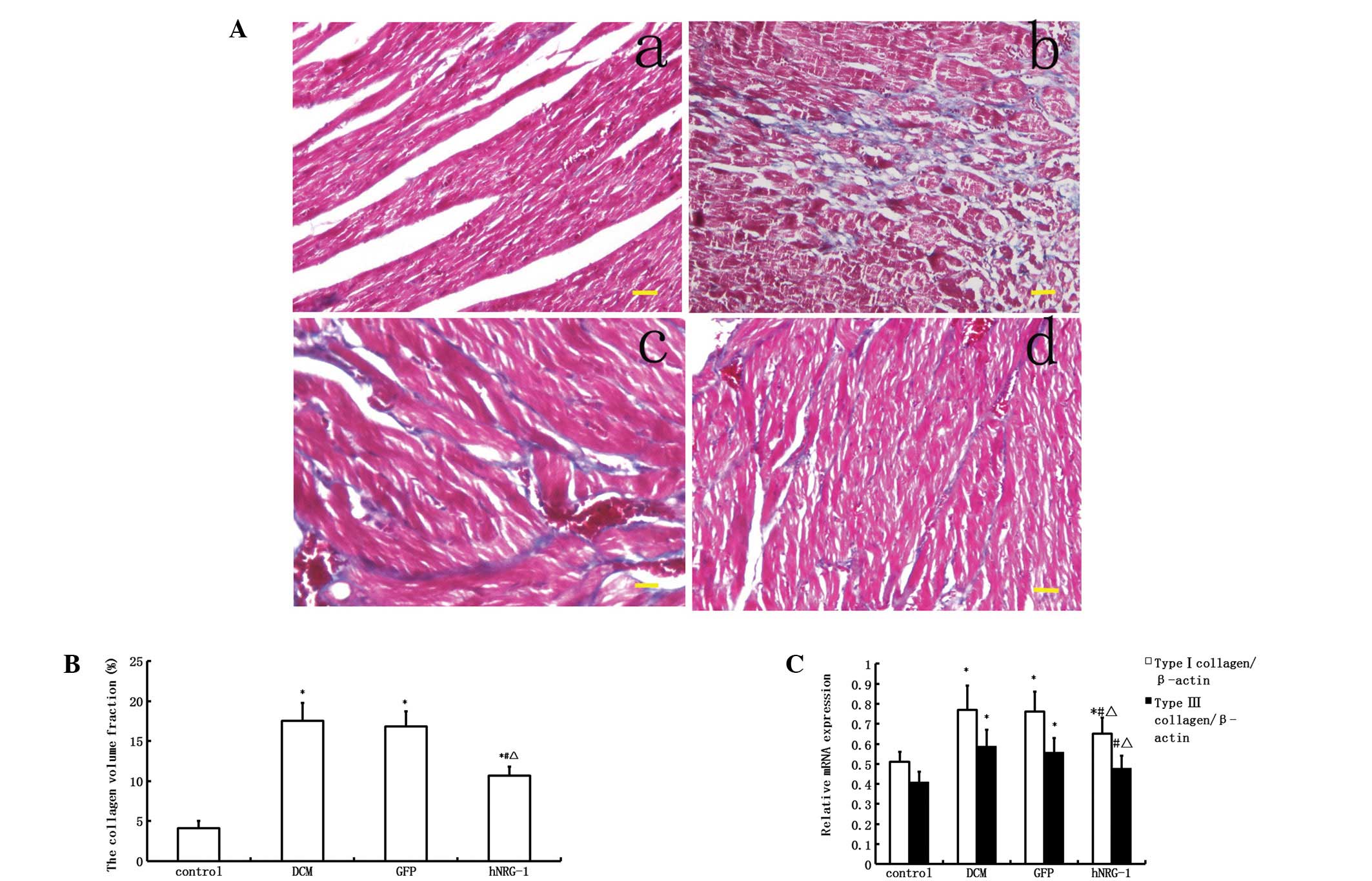 The collagen volume fraction, which is an indicator of interstitial fibrosis, was higher in the DCM group than in the control group (P<0.05, Fig. 4). Similarly, the collagen type I and III mRNA expression levels were also significantly upregulated in the DCM group compared with those in the control group (P<0.05, Fig. 4). The levels of myocardial fibrosis and of type I and III pro-collagen mRNA in the myocardium were markedly inhibited following cardiac transfection with rhNRG-1 rather than GFP, suggesting that hNRG-1 treatment attenuates the myocardial interstitial fibrosis caused by diabetes.