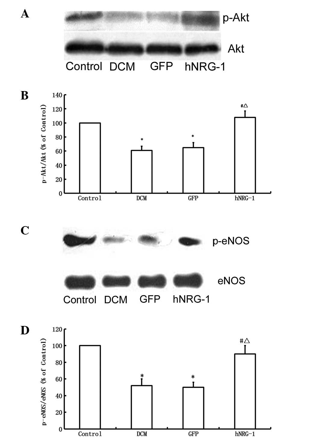 Samples of left ventricle myocardium were homogenized in tissue protein extraction reagent (Beyotime, Beijing, China) supplemented with protease inhibitors. After centrifugation at 12,000 × g for 10 min at 4°C, the supernatants were collected according to the manufacturer’s instructions. Protein concentration was measured using the BCA Protein Assay kit (Pierce Biotechnology, Rockford, IL, USA). Equal amounts of 20 μg protein were loaded onto 10% sodium dodecyl sulfate-polyacrylamide gels. hNRG-1, total Akt, phospho-Akt (p-Akt; phospho-Ser 473), total eNOS and phospho-eNOS (p-eNOS; phospho-Ser 1177) were detected with mouse anti-hNRG-1, rabbit anti-Akt-1/-2/-3, rabbit anti-phospho-Akt-1/-2/-3 (Ser 473), mouse anti-eNOS and rabbit anti-phospho-eNOS antibodies (Santa Cruz Biotechnology, Inc., Santa Cruz, CA, USA). After probing with these antibodies, the membranes were stripped of bound immunoglobulins. The immunoblots were developed by the enhanced chemiluminofluorescence method (Thermo Fisher Scientific, Hudson, NH, USA). The signals were quantified by densitometric analysis using a chemiluminescence imaging system (General Electric Company, Fairfield, CT, USA) and normalized to those of β-actin, an endogenous control protein.