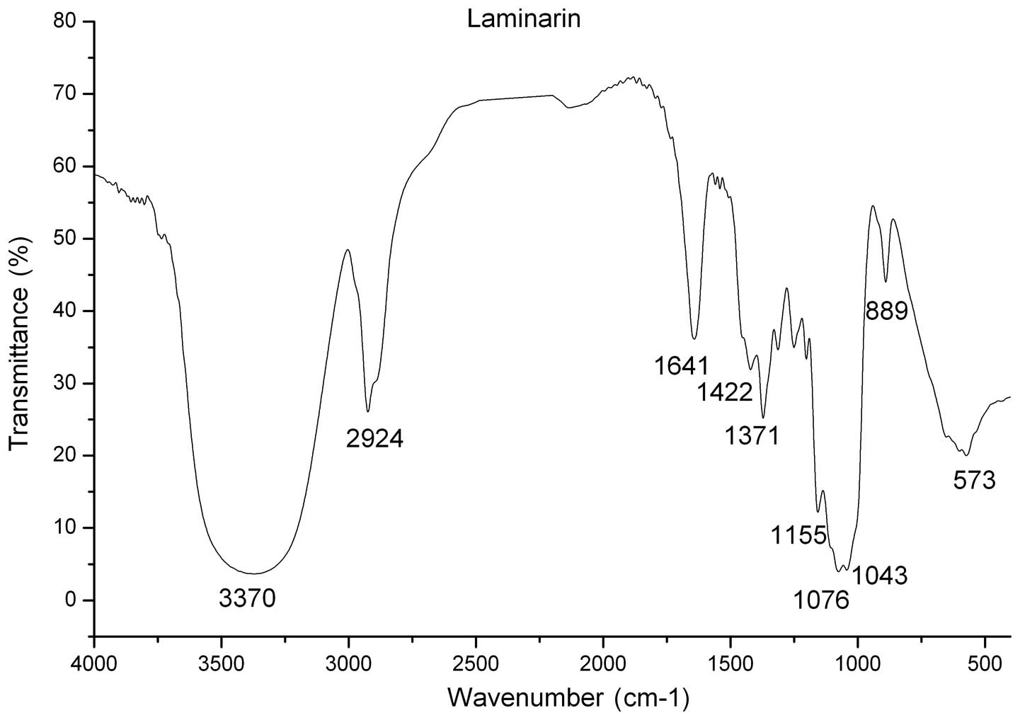 The IR spectrum of laminarin showed the characteristic absorption peak of -OH stretching vibration at 3,370 cm−1 and the peak of C-H stretching vibration in -CH3 or -CH2 groups appeared at 2,924 cm−1, which are the characteristic absorption peaks of sugar. The characteristic pyranose absorption peaks were also visible. The characteristic absorption peak of C-H scissor vibration appeared at 889 cm−1, which indicated that the glycosidic bond in laminarin was β type. Therefore, the laminarin had a pyranose skeleton with a β-glucosidic bond. These results are shown in Fig. 1 and Table I. By comparison, the IR spectrum of LAMS showed the characteristic absorption peaks of S=O and C-O-S stretching vibrations at 1,258 cm−1 and 816 cm−1, respectively, which indicated that the sulfates were introduced into the sugar molecules. The IR spectrum also showed that LAMS has a pyranose skeleton with a β-glucosidic bond. The IR data for LAMS are shown in Fig. 2 and Table I.