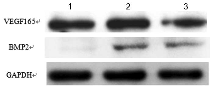 Western blot analysis indicated that the SD-MSCs which were transfected with Lv-BMP2-VEGF165 or Lv-BMP2 secreted large quantities of BMP2; however, the SD-MSCs which were not transfected secreted low quantities, as shown in Fig. 3. By contrast, in all of the groups, the SD-MSCs secreted large quantities of VEGF, irrespective of whether they were transfected with Lv-BMP2-VEGF165 or Lv-BMP2, or were not transfected.