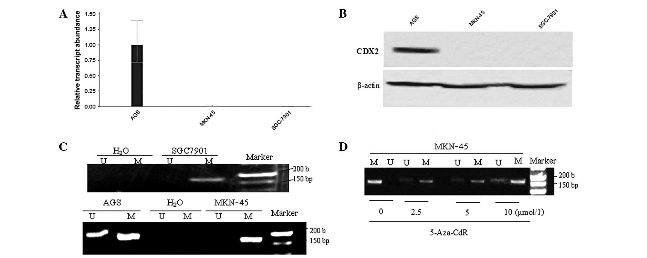 In the present study, the expression and association of CDX2 and DNMT1 mRNA in GC tissues and normal tissues distal to the GC were analyzed. To further elucidate the molecular mechanisms behind the inactivation of the CDX2 gene, we detected the promoter methylation status by methylation-specific PCR (MSP) and the expression of CDX2 mRNA and protein by real-time fluorescence quantitative polymerase chain reaction (RFQ-PCR) and western blotting in the GC cell lines AGS, MKN-45 and SGC-7901. We then investigated the ability of 5-aza-CdR to induce CDX2 gene re-expression and its effects and mechanisms in GC cell proliferation and apoptosis by treating MKN-45 cells with the demethylating agent 5-aza-CdR in vitro. Our study reveals that the loss of CDX2 function in GC may be attributed to promoter hypermethylation, and that the reactivation of CDX2 by 5-aza-CdR inhibits cell proliferation and induces caspase-3-independent apoptosis in GC cells.