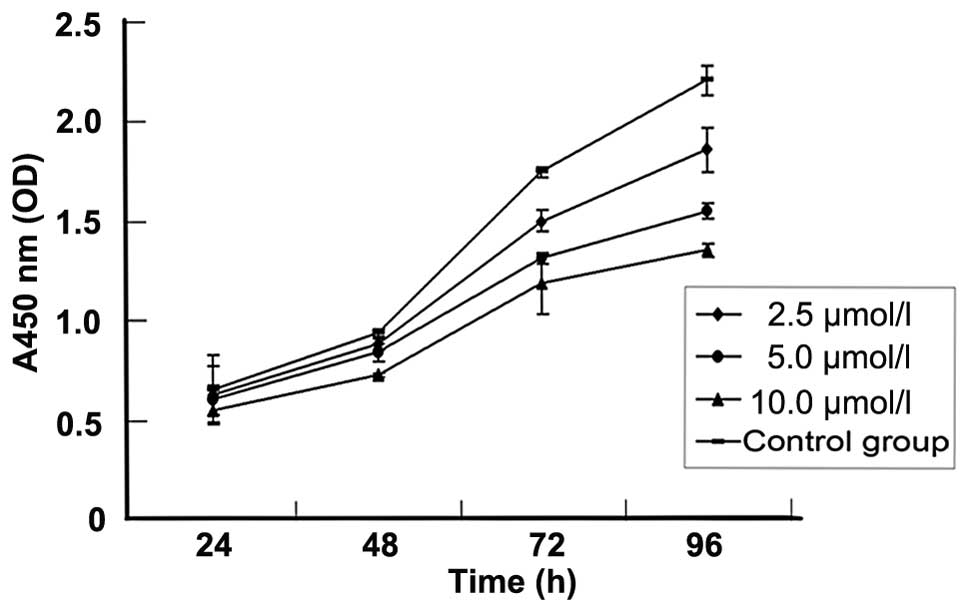 Cell proliferation was determined using a WST-8 Cell Counting Kit-8 (CCK-8; Dojindo Laboratories, Kunamoto, Japan) according to the manufacturer’s instructions. Briefly, cells (5×107 cells/l) suspended in RPMI-1640 medium (100 μl) containing 10% fetal bovine serum were seeded in 96-well plates and incubated for 24, 48, 72 and 96 h. CCK-8 solution (10 μl) was added to each well and the cultures were incubated at 37°C for 3 h. Absorbance at 450 nm was measured using an immunoreader. The results were plotted as means ± standard deviation of three separate experiments having four determinations per experiment for each experimental condition.