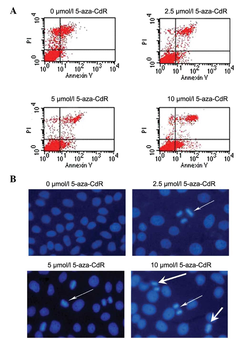 To examine whether 5-aza-CdR is able to efficiently trigger apoptosis, leading to cytotoxicity against MKN-45 cells, MKN-45 cells were treated with different concentrations of 5-aza-CdR for 72 h. Apoptosis was detected by Annexin V staining FCM assay and Hoechst 33258 staining. As shown in Fig. 4, the data revealed that 5-aza-CdR treatment increased the proportion of apoptotic cells from 0.9±2.3% in pretreated cells to 4.4±2.2, 7.5±1.5 and 15.5±5.0% after 5-aza-CdR treatment at 2.5, 5 and 10 μmol/l, respectively (P<0.05). In addition, Hoechst 33258 apoptosis staining showed morphological changes typical of apoptosis in the nuclear chromatin using fluorescence microscopy. This result strongly suggests that apoptosis rather than necrosis was the mechanism of 5-aza-CdR-induced growth inhibition in the MKN-45 cells.