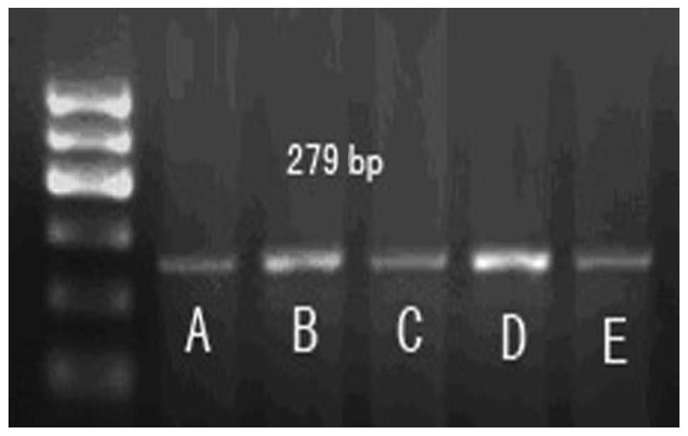 SPSS v13.0 (SPSS Inc., Chicago, IL, USA) was used to perform statistical analysis. Quantitative data were expressed as mean ± standard deviation. Single factor analysis of variance was performed to analyze the differences between the groups. P<0.05 was considered to indicate a statistically significant difference.