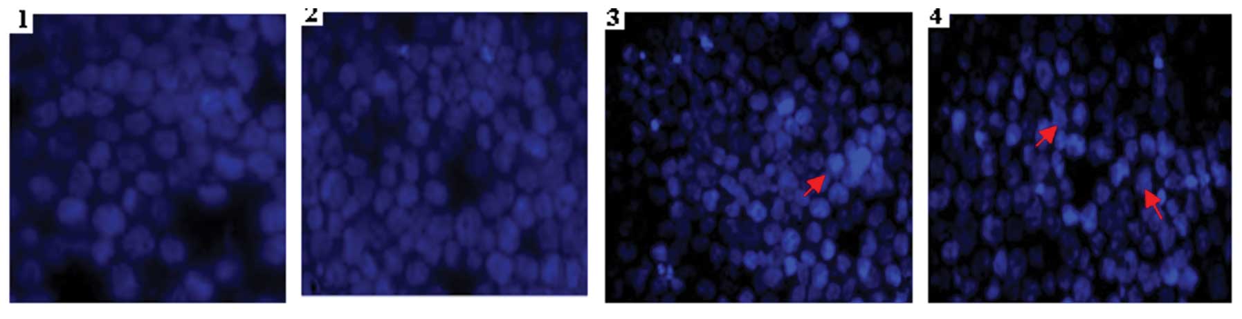 K562 cells transfected with PmiR-203 (0.8 μg/ml) were incubated for 48 h. Additionally, K562 cells treated with ATO (10 μg/ml) were also grown for 48 h. Then, the cells were collected by centrifuging at 4°C for 6 min at 111.8 × g and washed in phosphate-buffered saline (PBS). The cells were sprayed onto glass slides, air-dried and fixed with methanol for 10 min. Then, the cells were washed with buffer twice, stained with Hoechst 33258 for 10 min, washed with distilled water and finally air-dried again. The morphology of the K562 cells was observed under a fluorescent microscope.