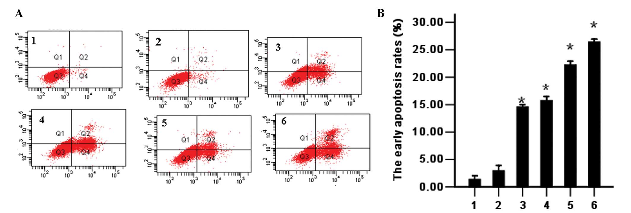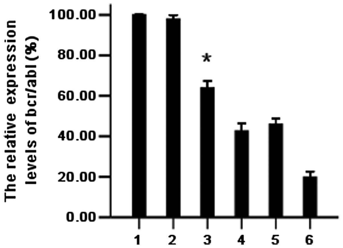 Pretreatment of K562 cells was performed as described above. The total RNA from the treated cells was extracted using TRIzol (Invitrogen) and was quantified using an ultraviolet spectrophotometer (UVP, Upland, CA, USA) at a wavelength of 260 nm. The bcr/abl expression level was determined by real-time PCR using M-MLV reverse transcriptase. A 20 μl reverse transcription reaction was incubated at 37°C for 30 min. Real-time PCR was performed using a PCR amplifier (Bio-Rad). The PCR cycles were as follows: initial denaturation at 94°C for 3 min, then 40 cycles of denaturing at 94°C for 20 sec, annealing at 50°C for 25 sec and synthesis at 72°C for 20 sec, as per the manufacturer’s instructions. The GAPDH gene was used as the internal control. The expression level was calculated using cycle threshold (Ct) values and the 2−ΔΔCt method.