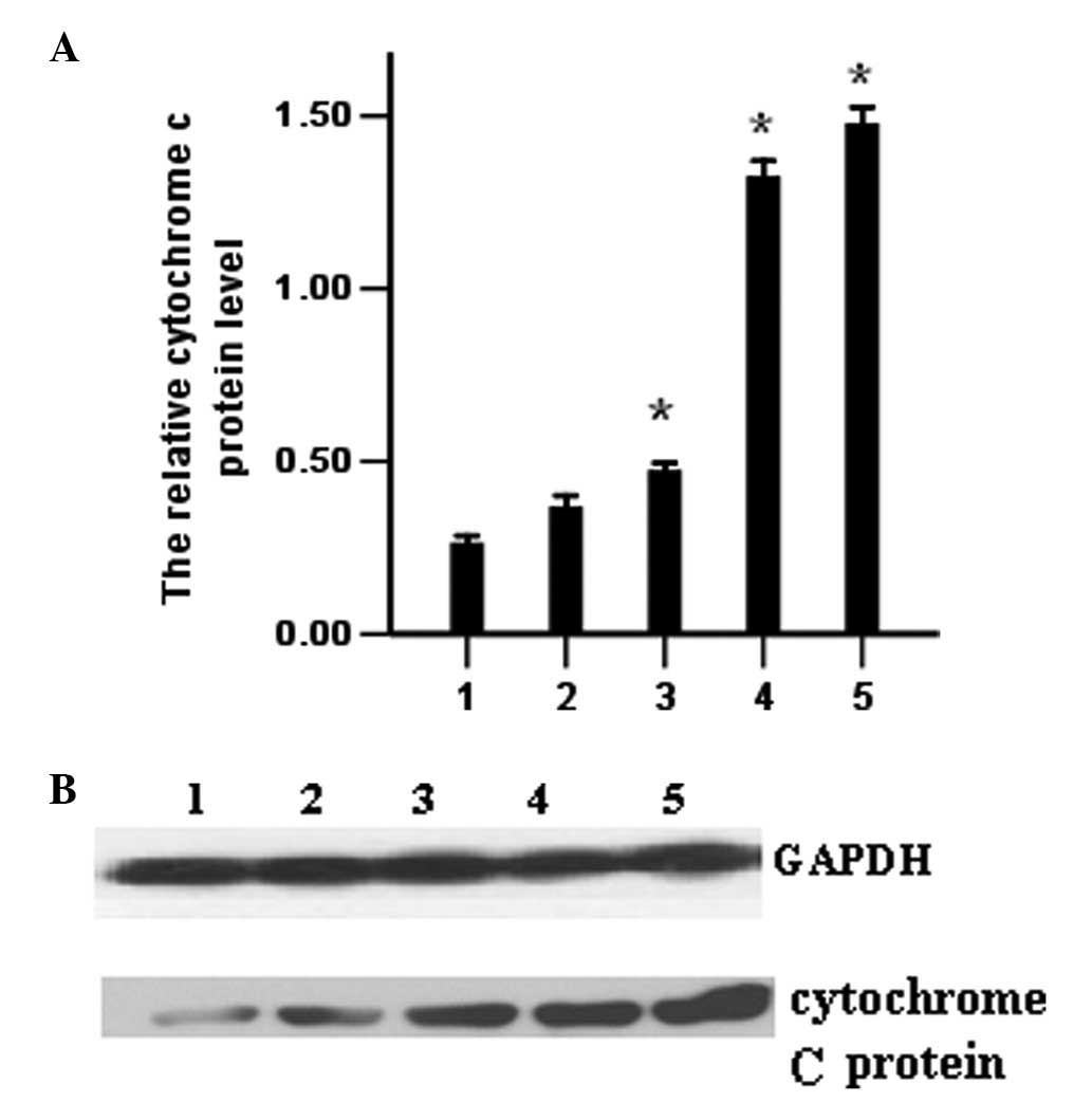The cells were analyzed in RIPA buffer in the presence of a proteinase inhibitor. The protein concentration was determined using BCA. Proteins (30 μg) were separated using 10% sodium dodecyl sulfate-polyacrylamide gel electrophoresis (SDS-PAGE) and transferred to a nitrocellulose membrane. Membranes were probed with primary antibodies against cytochrome c (rabbit polyclonal; Cell Biotech, Tianjin, China) at room temperature for 2 h, washed extensively with 0.1% Tween-20 in PBS and incubated with secondary antibodies conjugated with horseradish peroxidase at a dilution of 1:10,000 (Pharmingen, Becton Dickinson, San Diego, California, USA), at room temperature for 3 h. Development was performed using an enhanced chemiluminescence (ECL) system (Amersham Pharmacia Biotech, Amersham, UK).