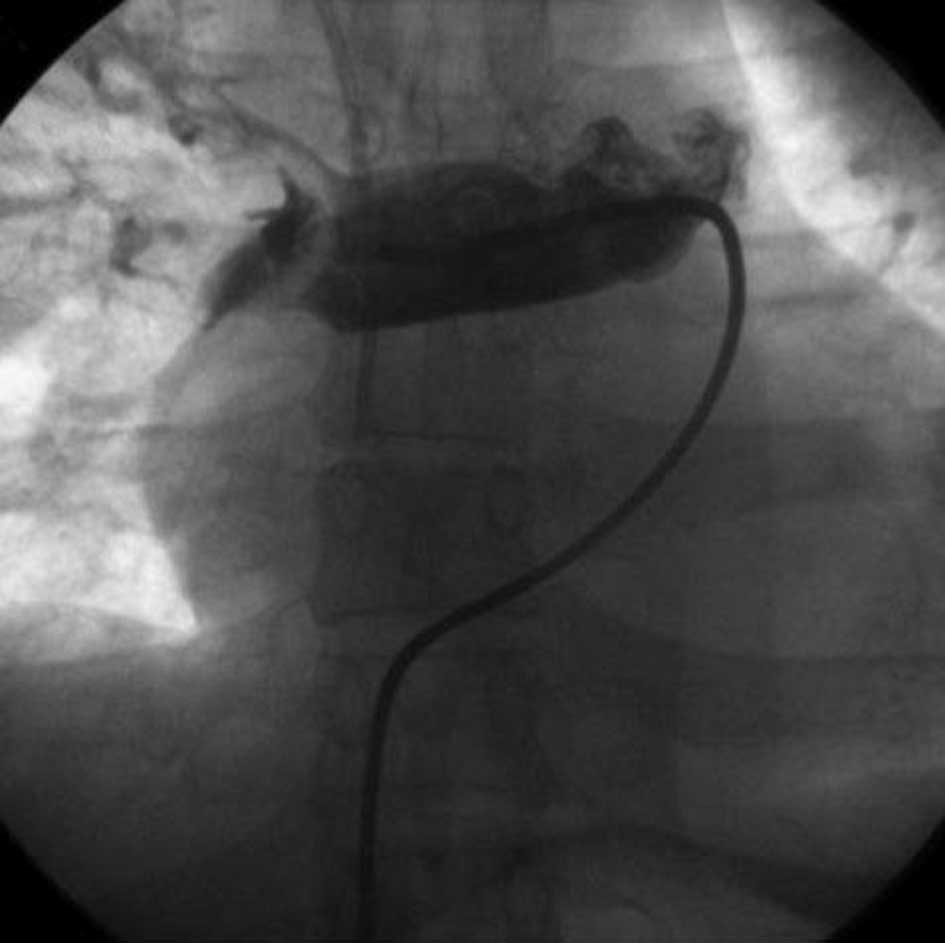 Following the above therapies, digital subtraction angiography (DSA) of the deep veins of the lower limbs and the inferior vena cava demonstrated unobstructed blood flow, with no apparent thrombosis. A 4–5F double J tube was inserted through the right femoral vein to the main pulmonary artery for DSA of the pulmonary artery, to confirm the filling defect in the right main pulmonary artery (Fig. 3). An exchange guide wire was then inserted to coordinate with the tube for twists and drags to disintegrate the embolus. Following disintegration of the embolus, 500,000 units urokinase were injected into the tube for thrombolysis over 30 min. Subsequent DSA of the pulmonary artery indicated an improvement in the filling defect compared with before treatment (Fig. 4). The patient’s condition was significantly alleviated and the anoxia was reduced. A blood gas assay performed 2 h after surgery indicated a pH of 7.51, 72 mmHg PaO2, 29 mmHg PaCO2 and 23.1 mmol/l HCO3− (under the condition of a low flow rate of oxygen inhalation).